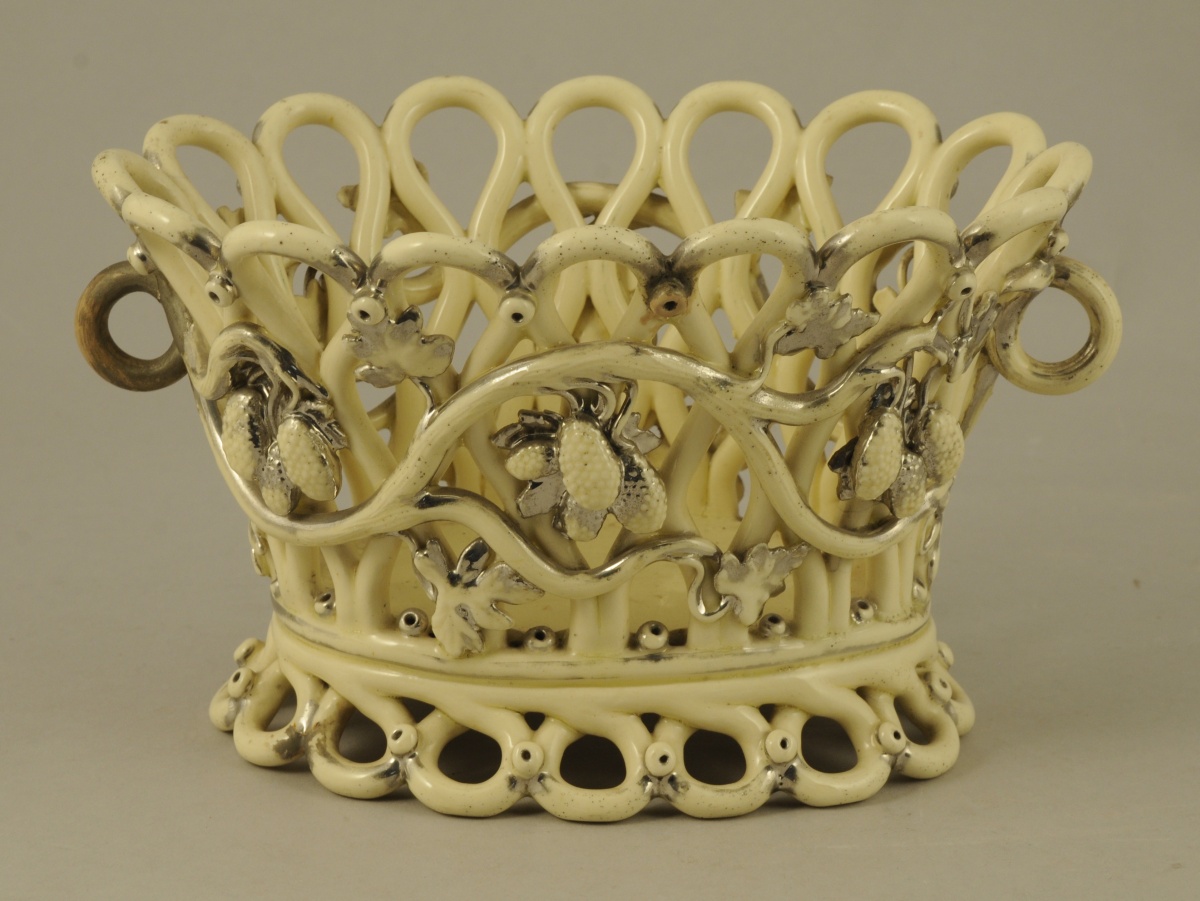 LANGEAIS. CORBEILLE cache-pot ovale en faïence fine à fond blanc crémeux. Décor de rinceaux et de grappes de fruits relevé de lustre platine. Cachet "CB" (pour Charles de Boissimon) dans un cartouche en creux sous la base. Fin XIXème. Haut. 14, Larg. 23 cm. (sans anneaux mobiles, une anse restaurée)
