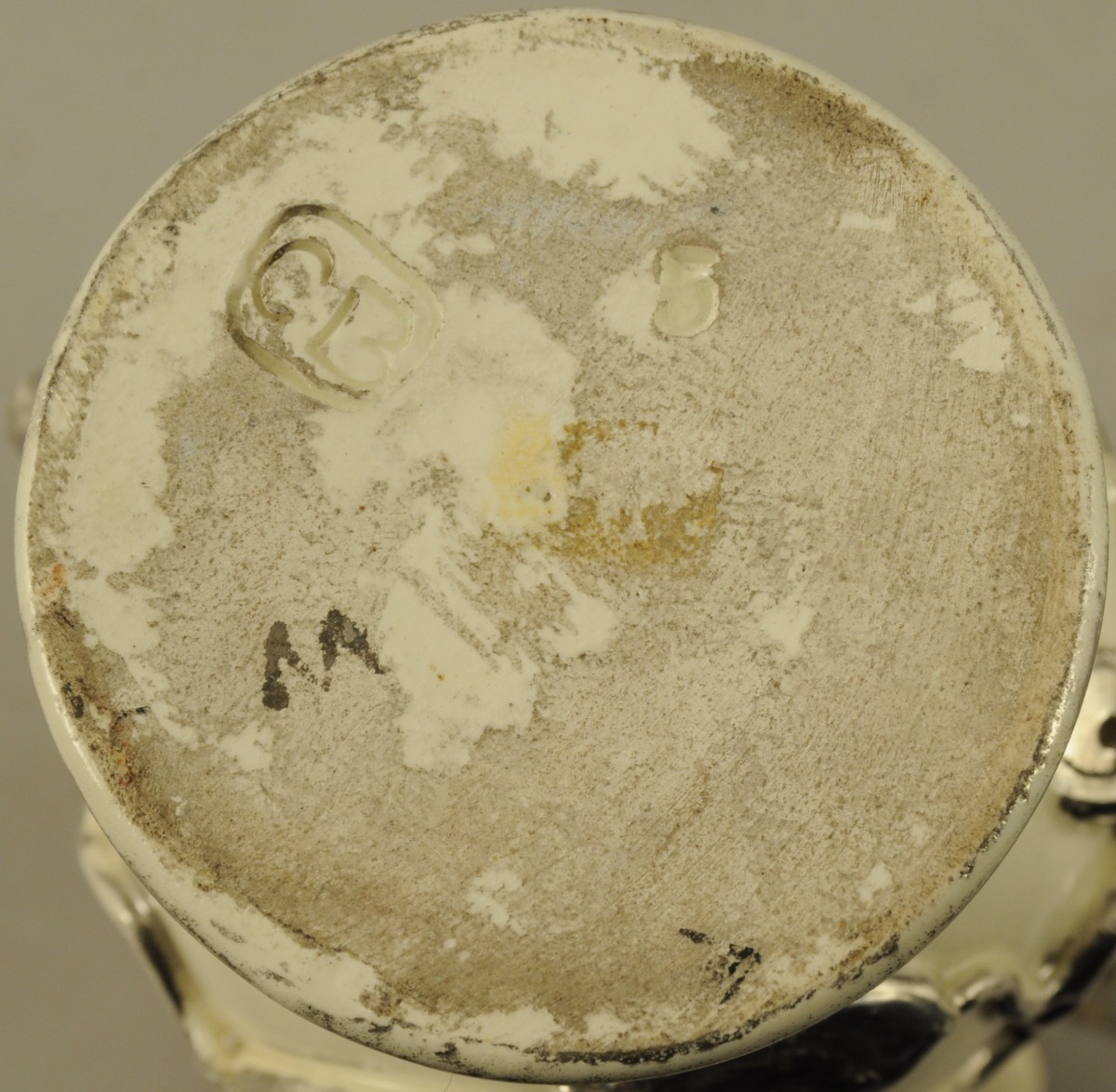 LANGEAIS. Petit VASE globulaire à long col en faïence fine à fond blanc crémeux. Anses en forme de branchages et décor de tiges et de fruits relevé de lustre platine. Marque CB en creux sous le pied. Fin XIXème. Haut. 13, Diam. 8 cm.