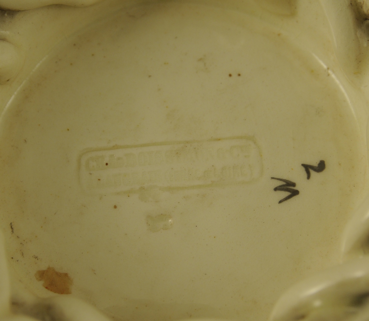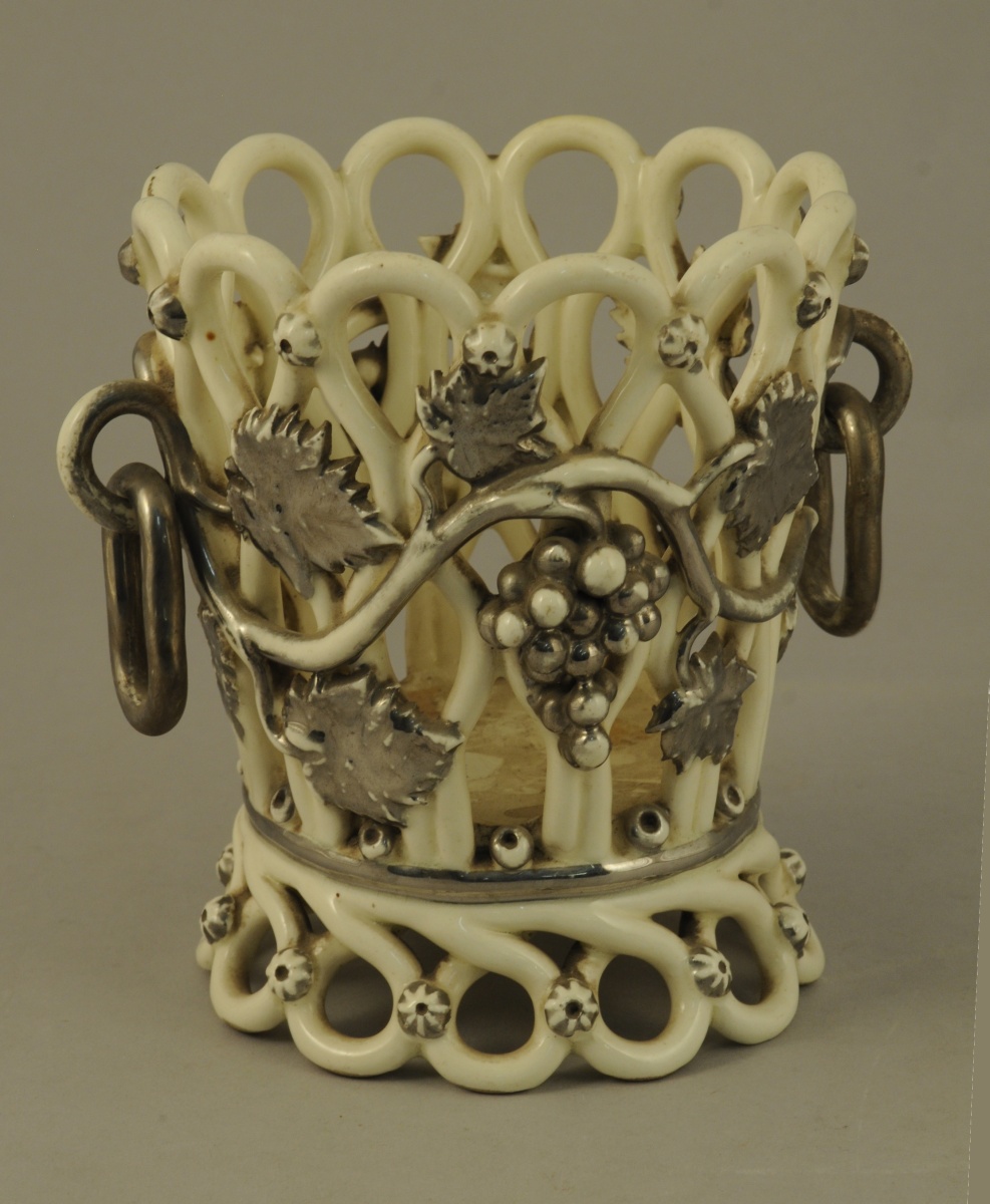 LANGEAIS. CORBEILLE cache-pot circulaire en faïence fine à fond blanc crémeux. Anses mobiles et décor de pampres de vigne et de grappes relevé de lustre platine. Marque en creux sous la base : "Ch. de Boissimon et Cie à Langeais (Indre-et-Loire)". Fin XIXème. Haut. 16,5, Diam. 14 cm.