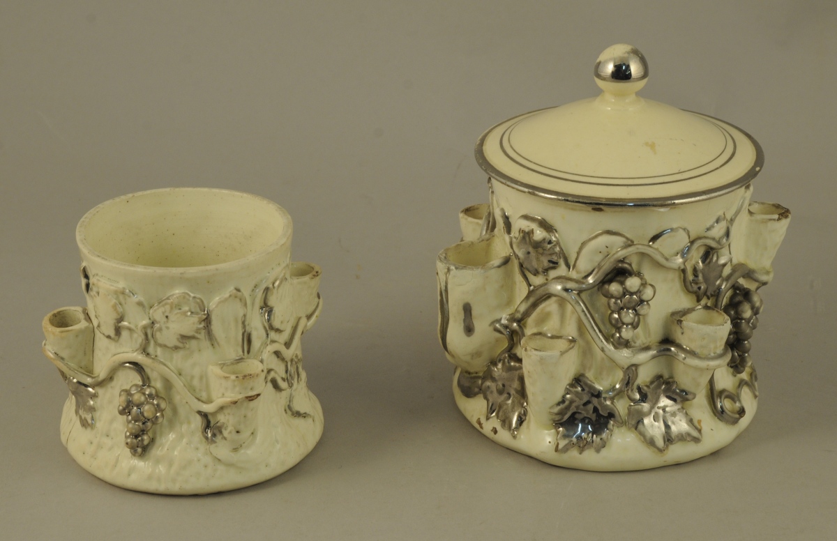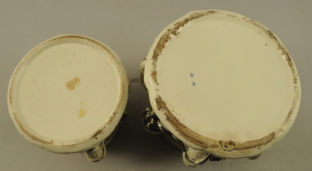 LANGEAIS. Réunion de deux POTS à TABAC avec porte-pipes en faïence fine à fond blanc crémeux, en forme de troncs. Décor de pampres et de grappes de raisins relevé de lustre platine. Marque CB en creux sous le pied.