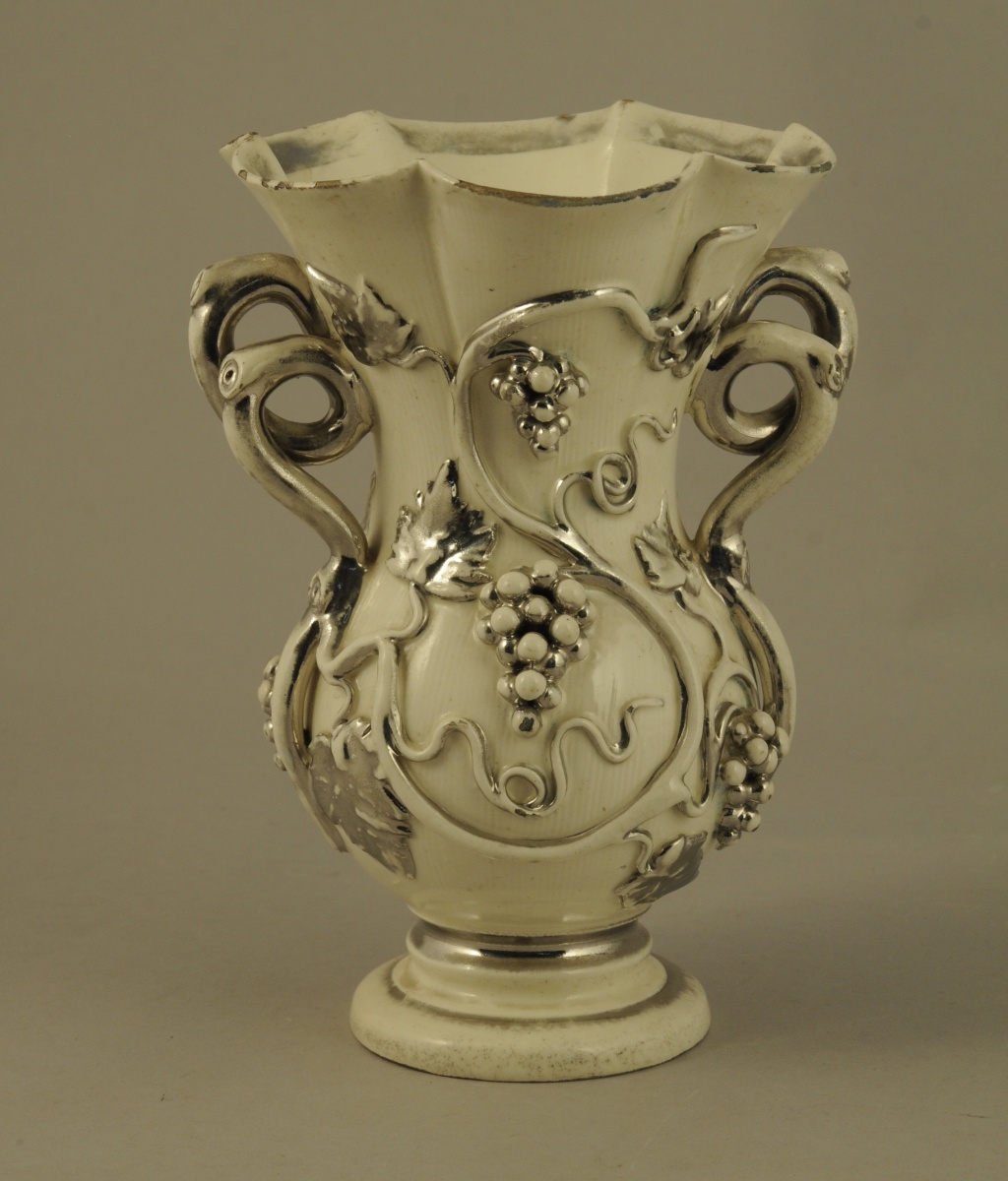 LANGEAIS. VASE balustre à col hexalobé en faïence fine à fond blanc crémeux. Décor de pampres de vigne et de grappes de raisin relevé de lustre platine. Marque "CB" en creux sur le pied. Fin XIXème. Haut. 20,2 cm.