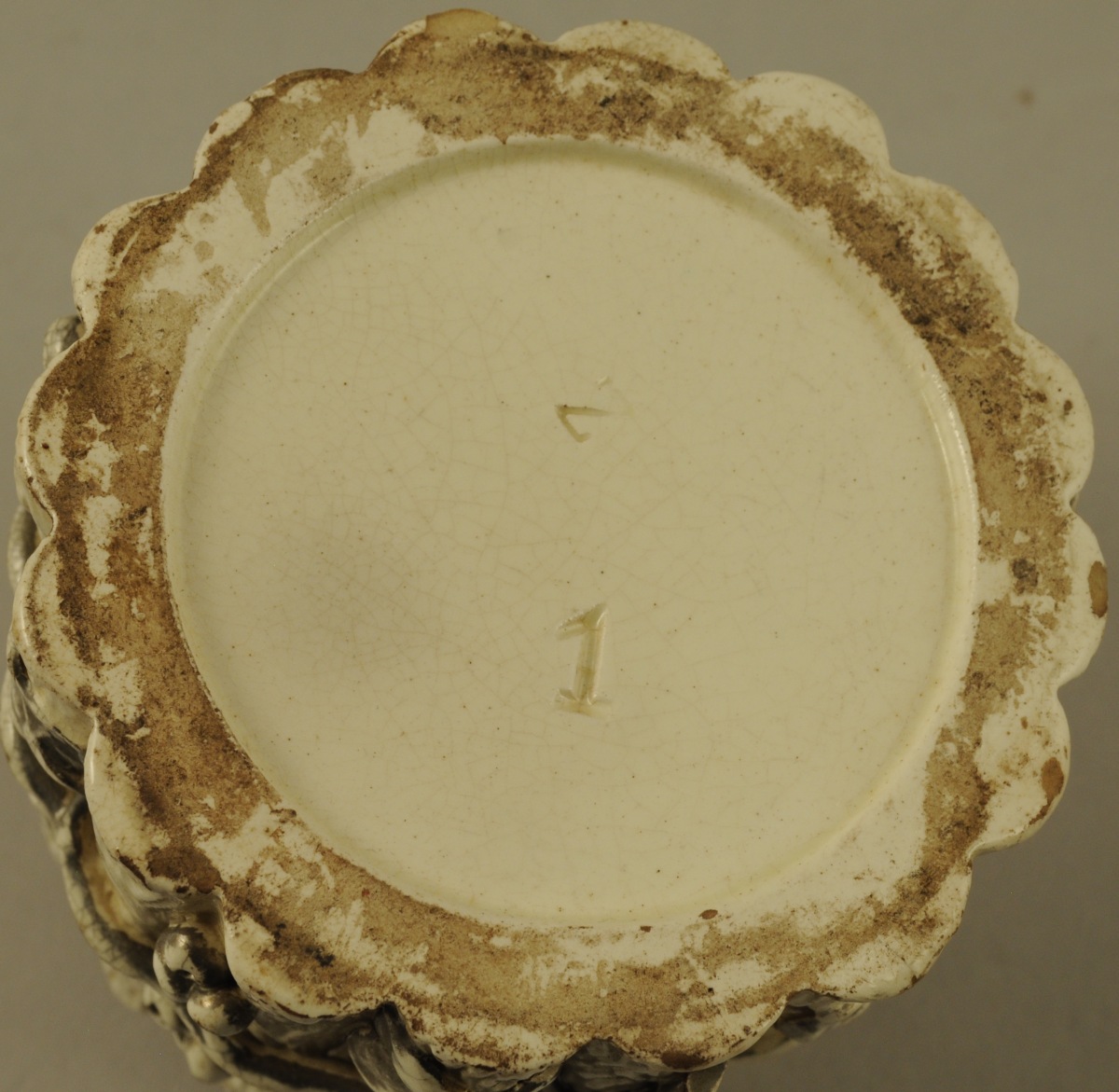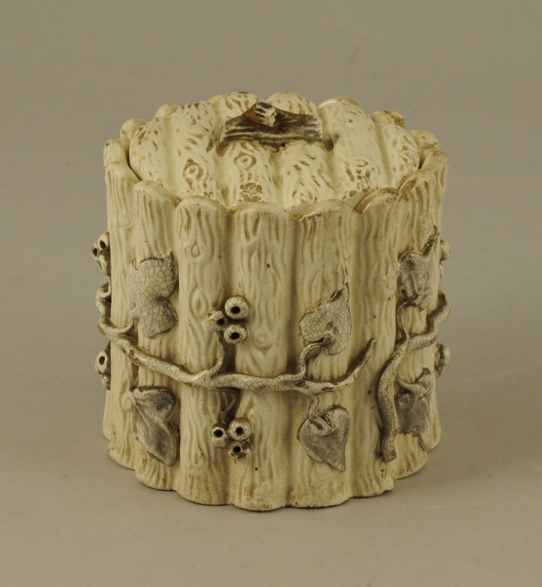 LANGEAIS. POT A TABAC à côtes imitant des rondins de bois, en faïence fine blanc crémeux. Décor de pampres et de baies relevé de lustre platine. Fin XIXème. Haut. 10 cm. (éclat et fretel accidenté)