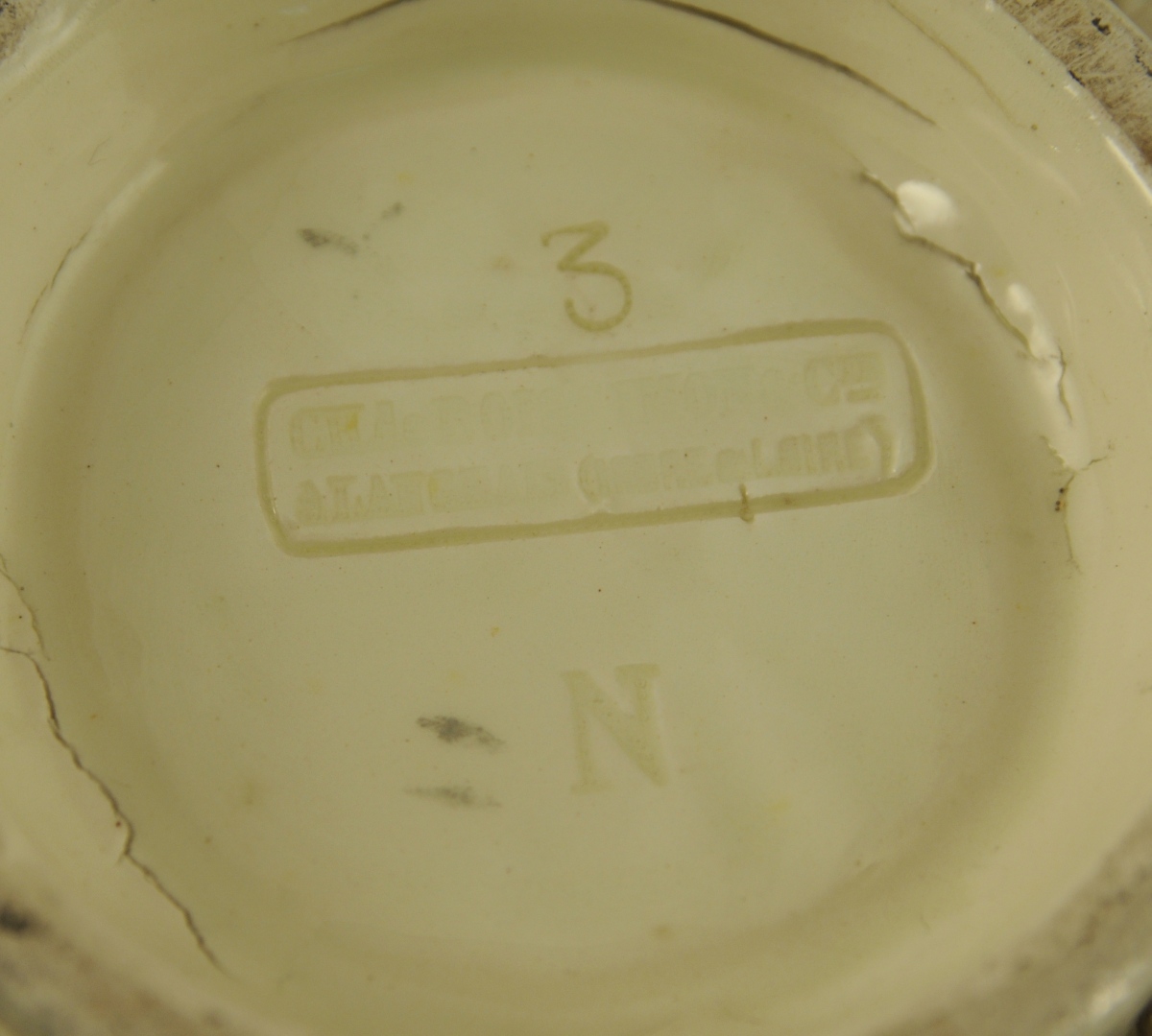 LANGEAIS. CORBEILLE cache-pot circulaire en faïence fine à fond blanc crémeux. Décor de pampres de vigne et de grappes relevé de lustre platine. Marque en creux "Charles BOISSIMON &Cie à Langeais". Fin XIXème. Haut. 18, Diam. 19 cm. (manques)