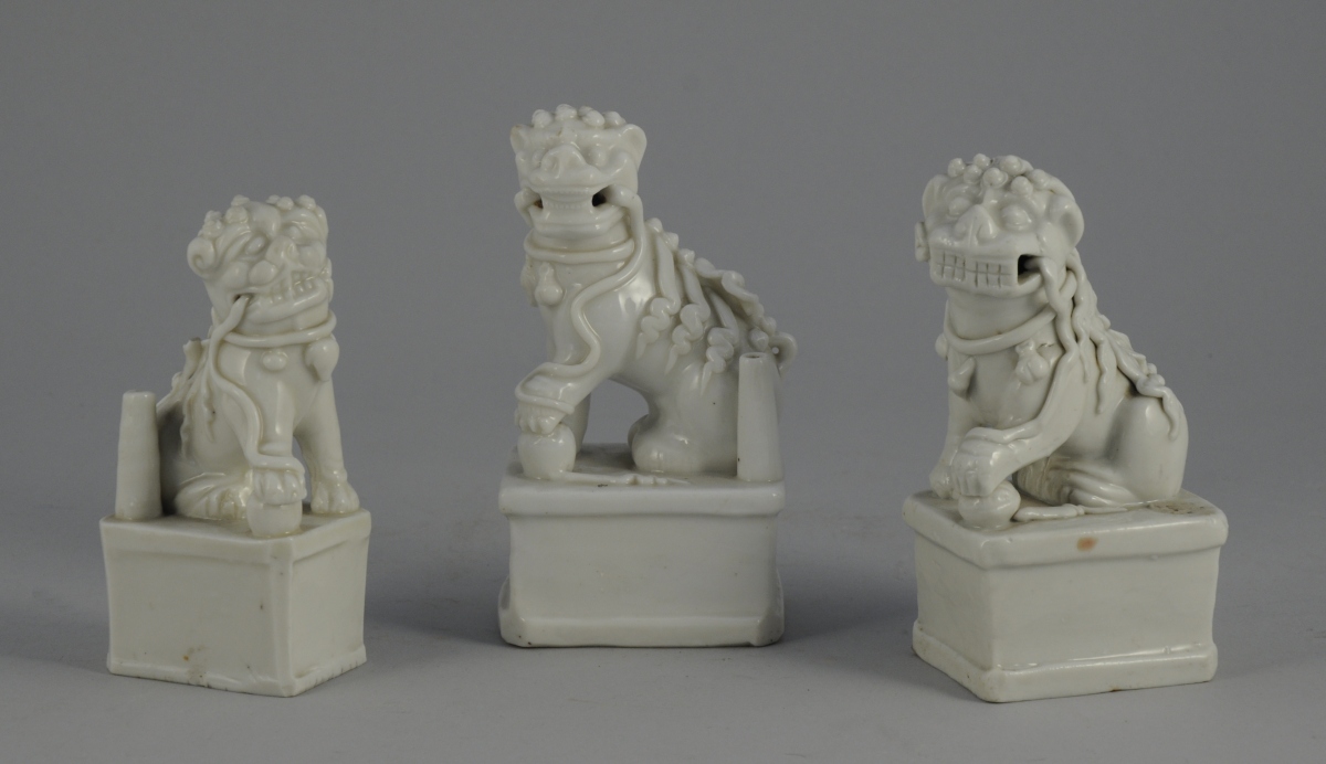 Ensemble de trois CHIMÈRES assises, formant porte-baguettes d'encens en porcelaine émaillée blanc de Chine. Chine, époque QIANLONG (1736-1795). Haut. 13 cm (manque les porte-baguettes de l'une).