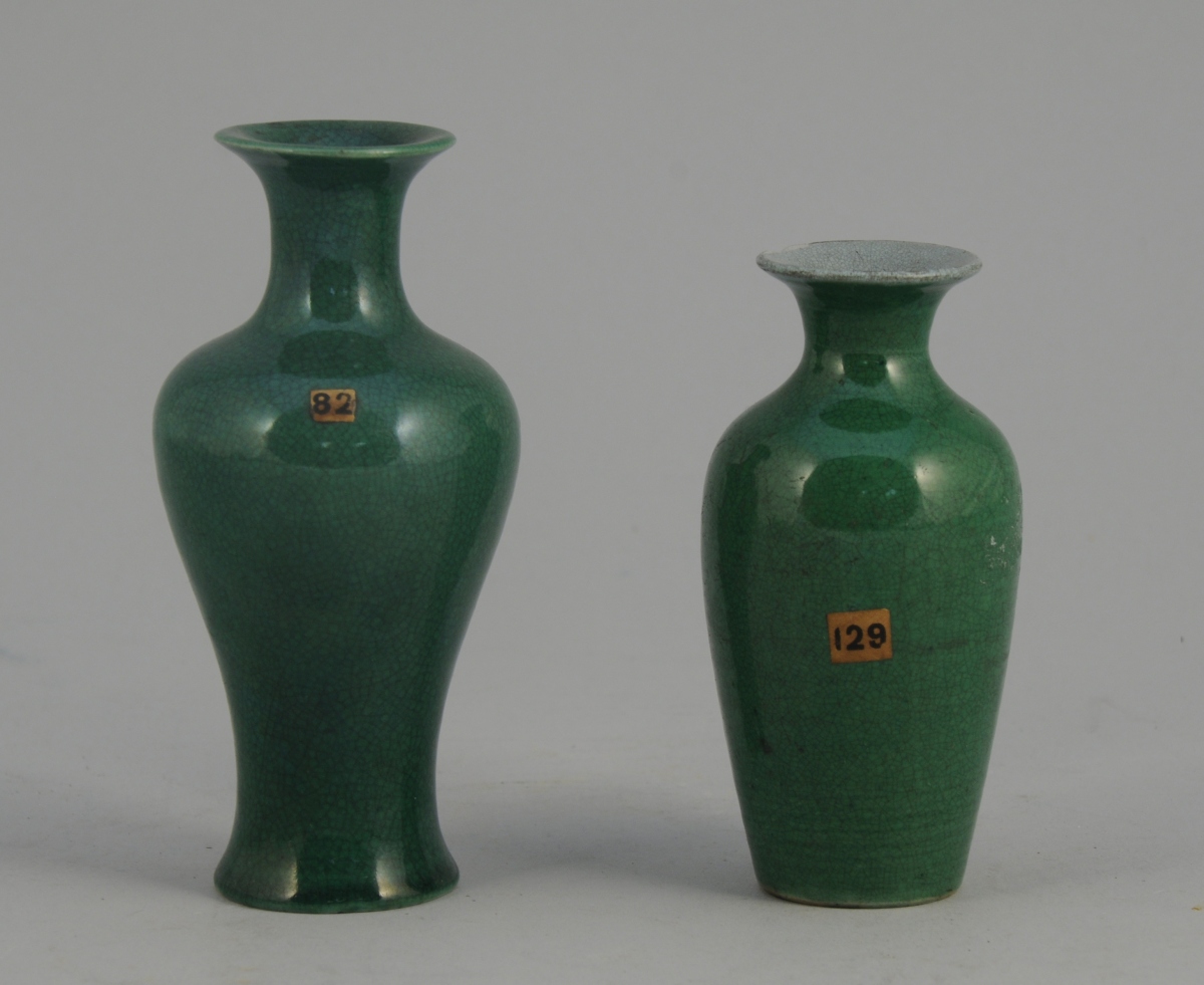 Deux petits modèles de VASES en porcelaine émaillée vert. Chine, XVIIIème. Haut. 13 et 11 cm (l'un accidenté).