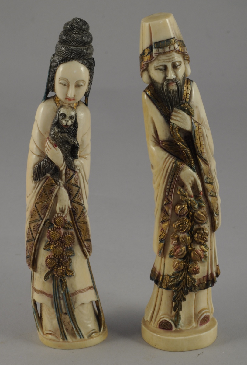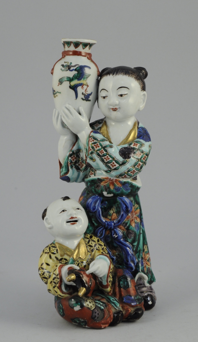 GROUPE en porcelaine polychrome et or représentant deux jeunes garçons, l'un assis tenant un masque, l'autre debout soutenant un vase. Chine ou Japon. Haut. 32 cm (accident et manque)