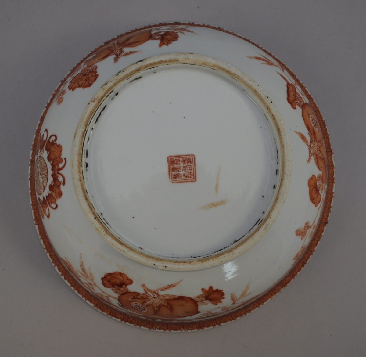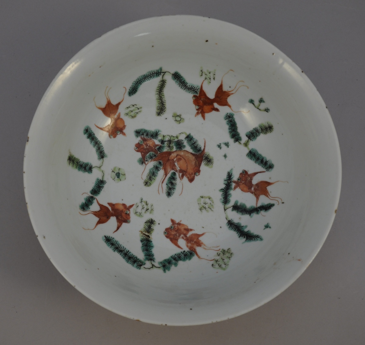 COUPE en porcelaine à décor de cypprins. Chine. XXème. Haut. 9,5 Diam. 27 cm. (égrenures)