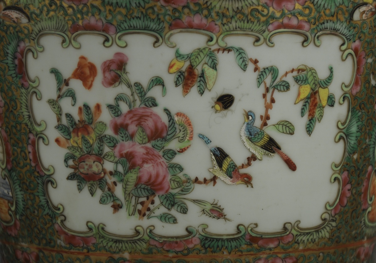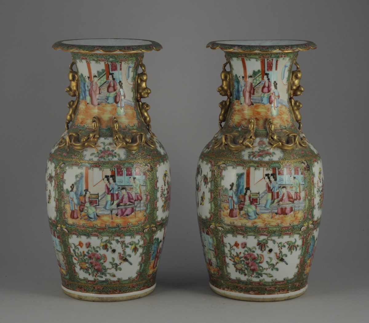 PAIRE de VASES en porcelaine à décor de scènes de cour alternées de compositions florales dans des réserves. Col polylobé. Rehauts or. Chine, Canton. XIXème Haut. 45 cm.