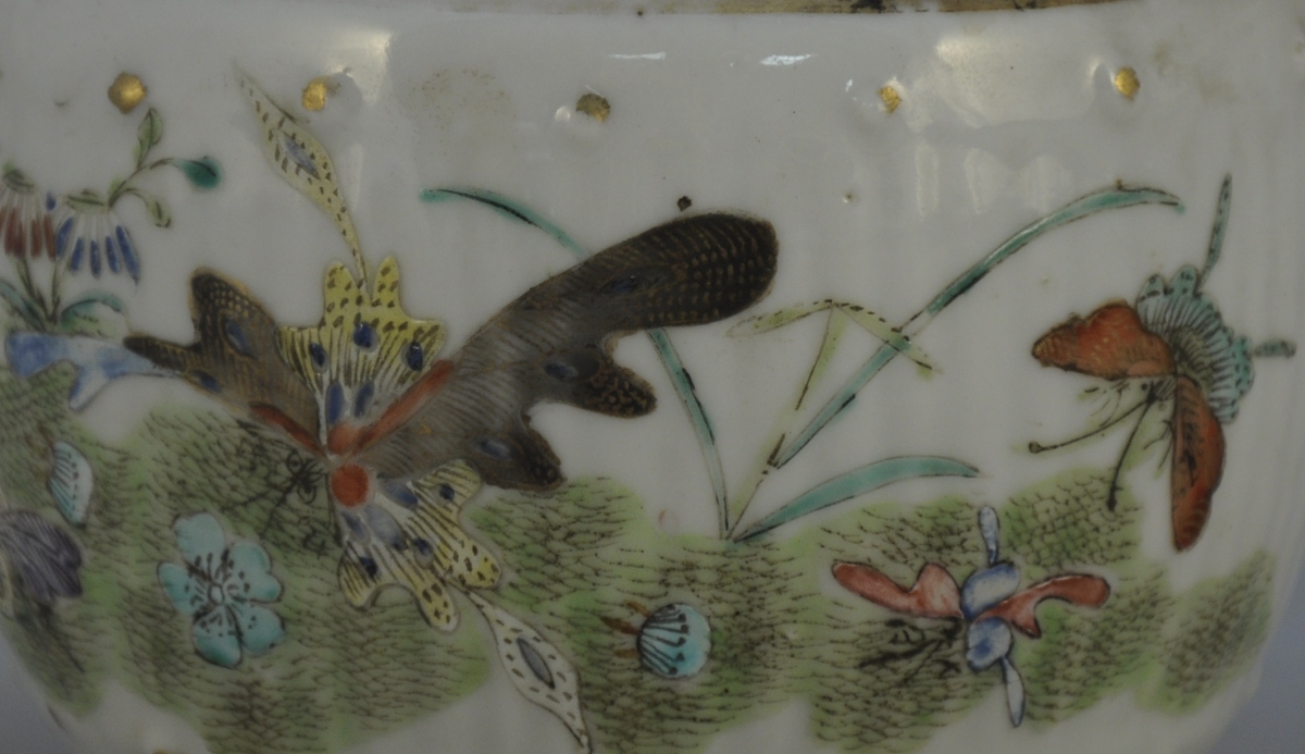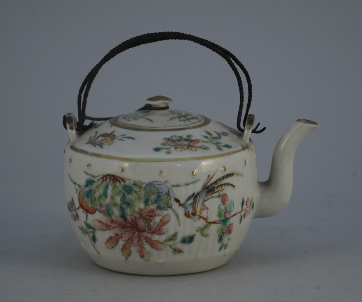 THÉIÈRE en porcelaine, le corps à légères côtes à décor polychrome de fleurs, oiseaux et papillons.