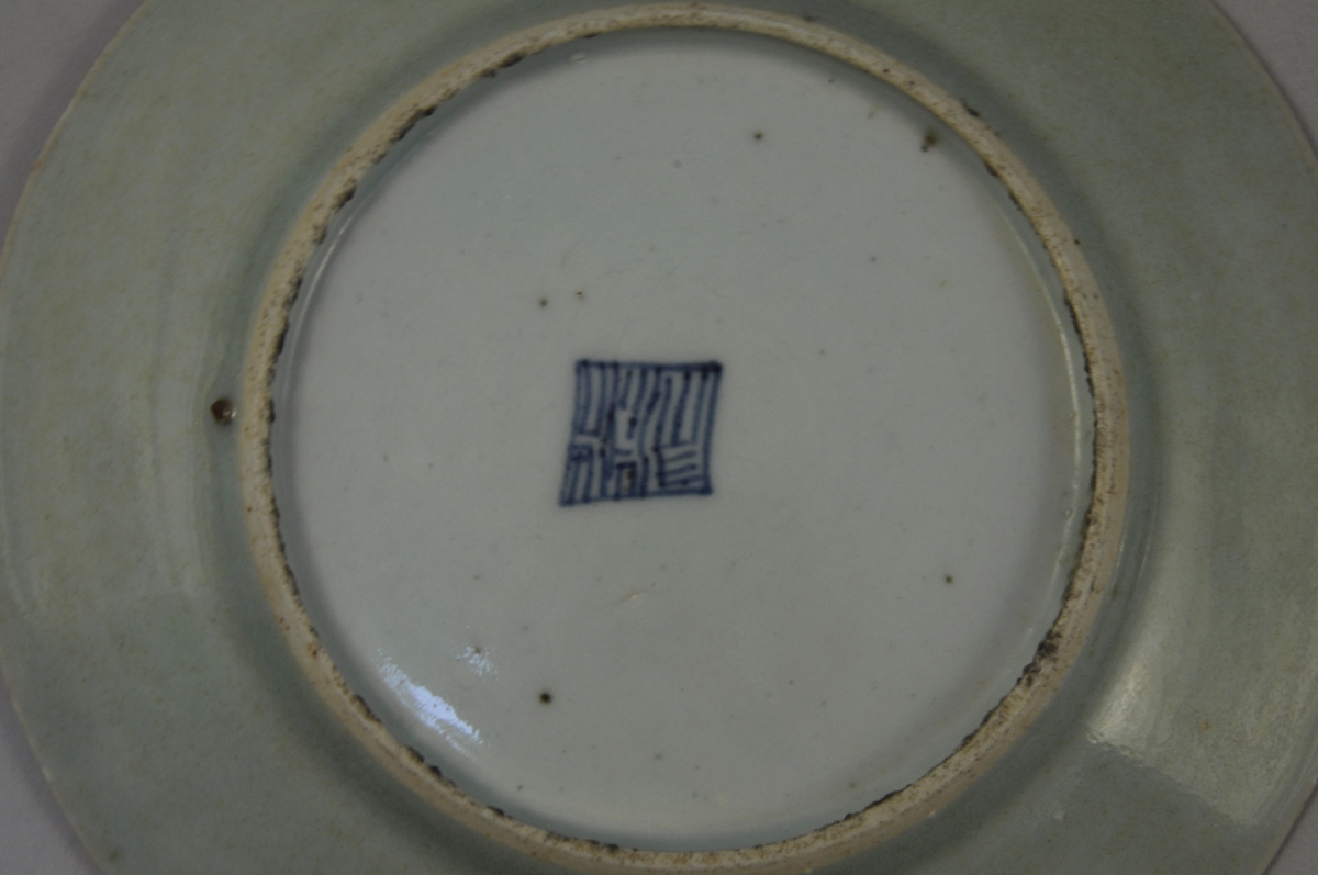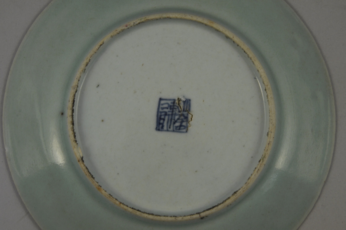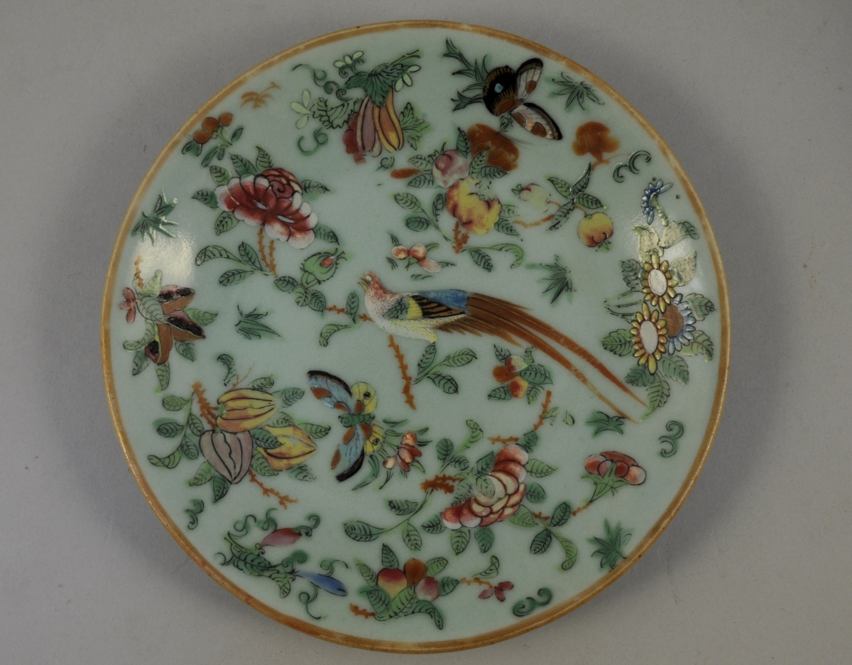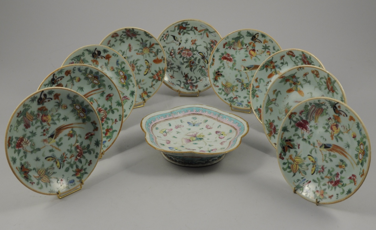 CHINE, CANTON. Suite de neuf assiettes en porcelaine à décor d'émaux polychromes figurant des insectes et des oiseaux sur des tiges fleuries. Bordures dorées. Cachet bleu au revers. Fin XIXème - Début XXème. Diam. 18 cm. (quelques égrenures)