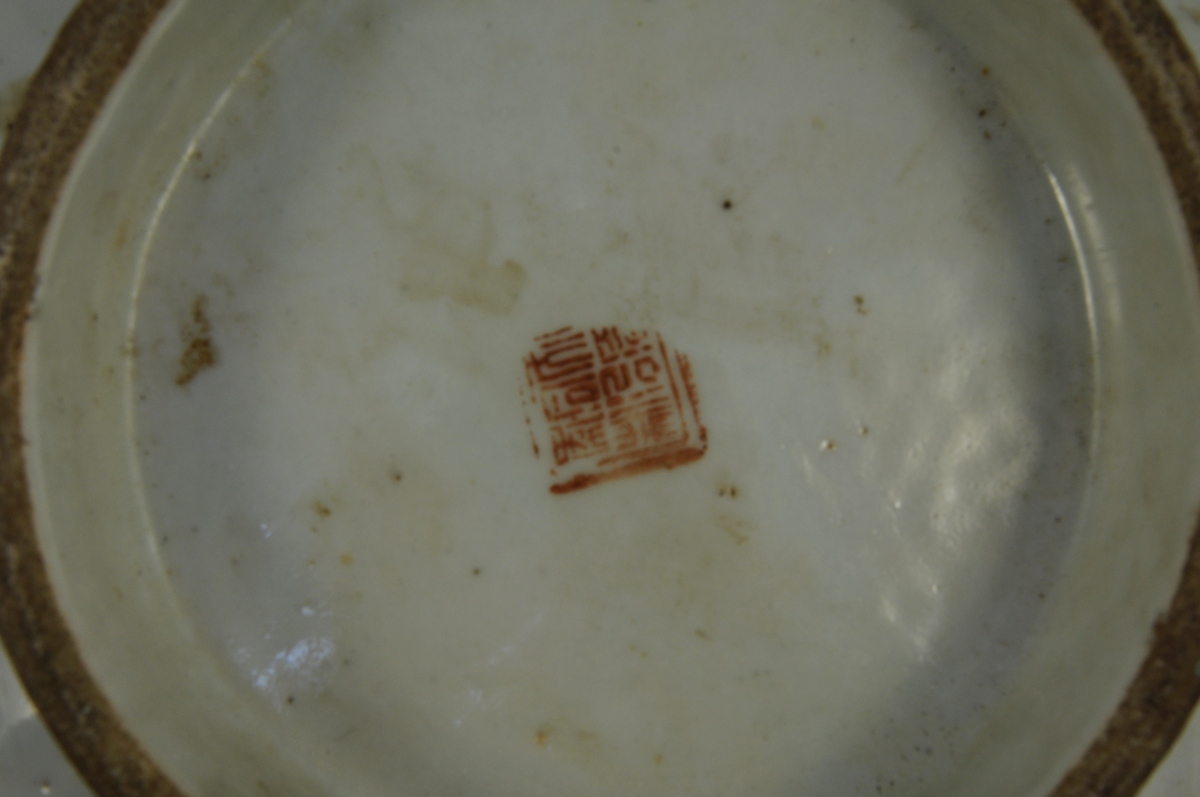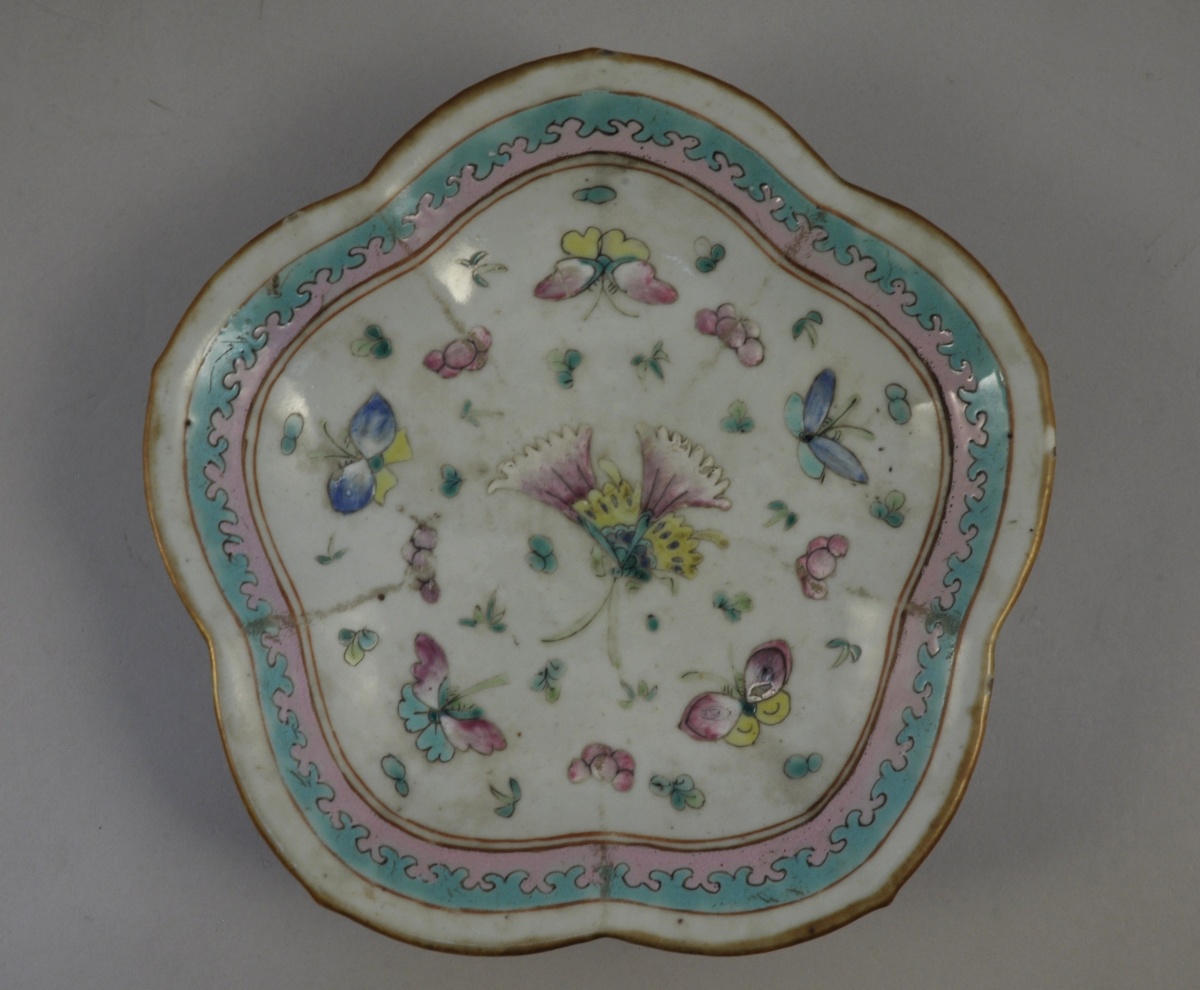 JOINT : CHINE, CANTON. Coupe polylobée sur piédouche en porcelaine, à décor émaillé. Cachet rouge au revers. Diam. 21 cm.