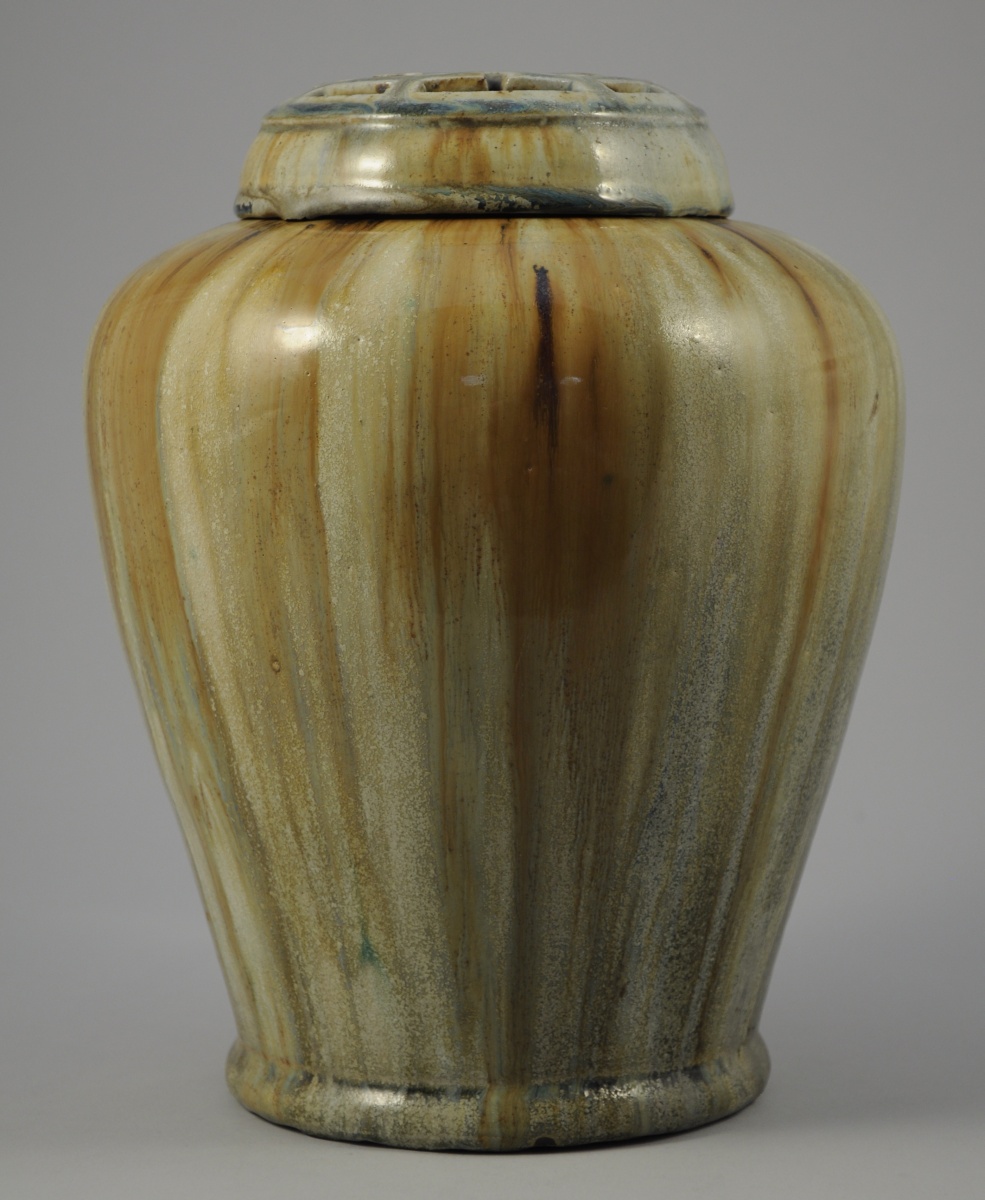 POT COUVERT en grès émaillé beige flammé. Couvercle ajouré d'un caractère " shou " stylisé. Shiwan, XIXème. Haut. 30 cm.