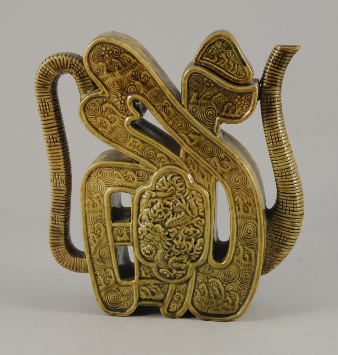 VERSEUSE en céramique émaillée marron en forme d'idéogramme. Chine, XIXème. Haut. 23,5 cm.