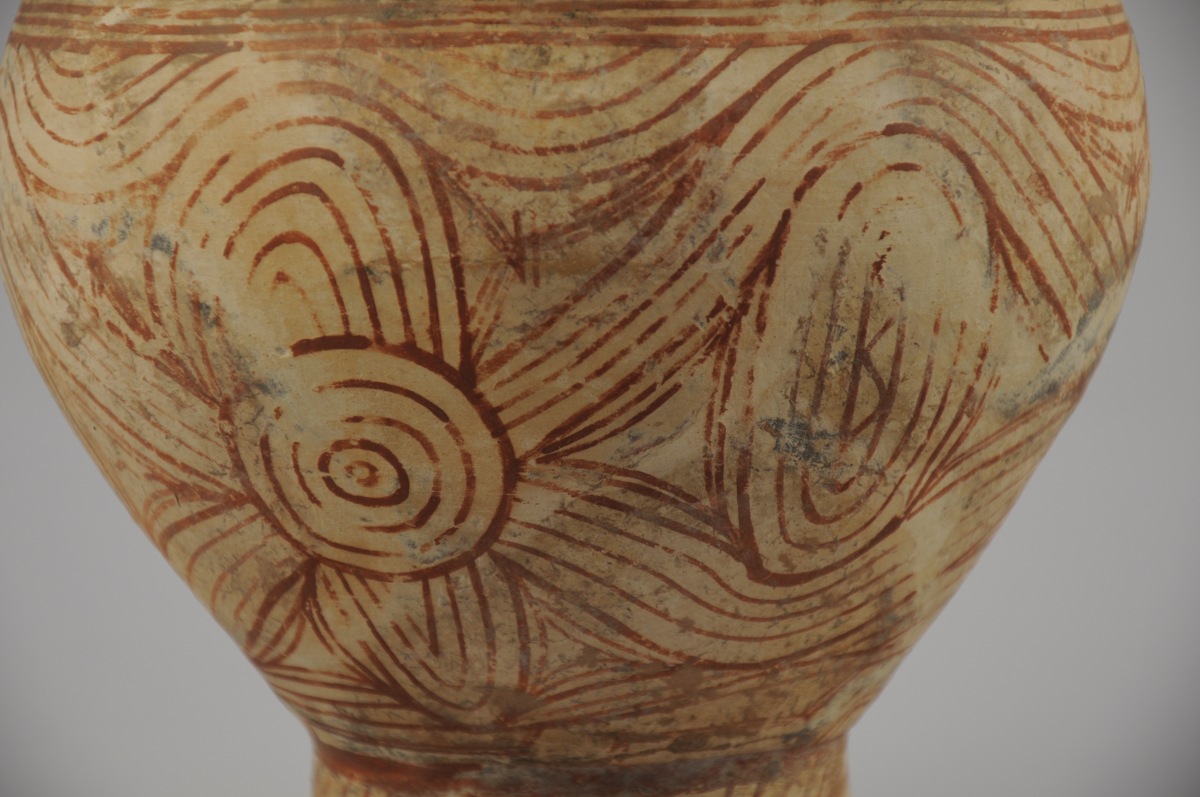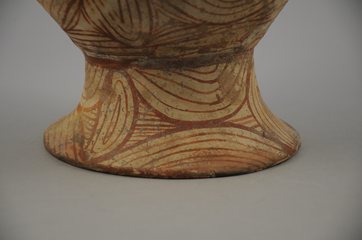 VASE à panse piriforme, reposant sur un large piédouche. Terre cuite à engobe crème, à décor linéaire ocre.