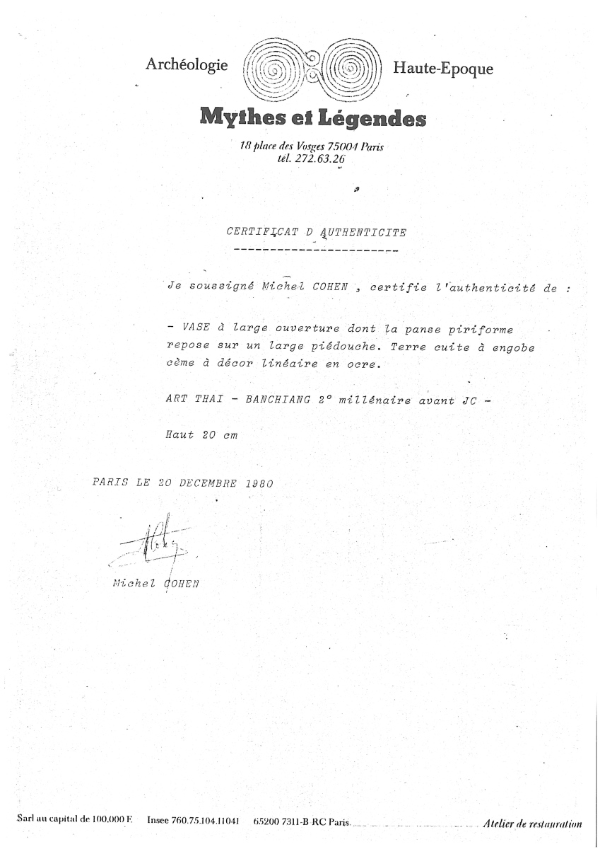 Certificat de Michel Cohen, Mythes et Légendes, 20 décembre 1980.