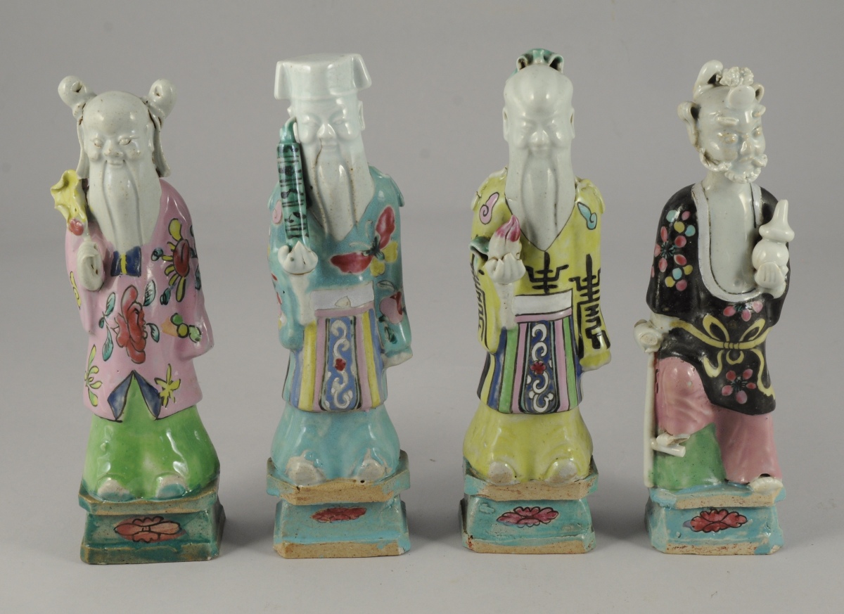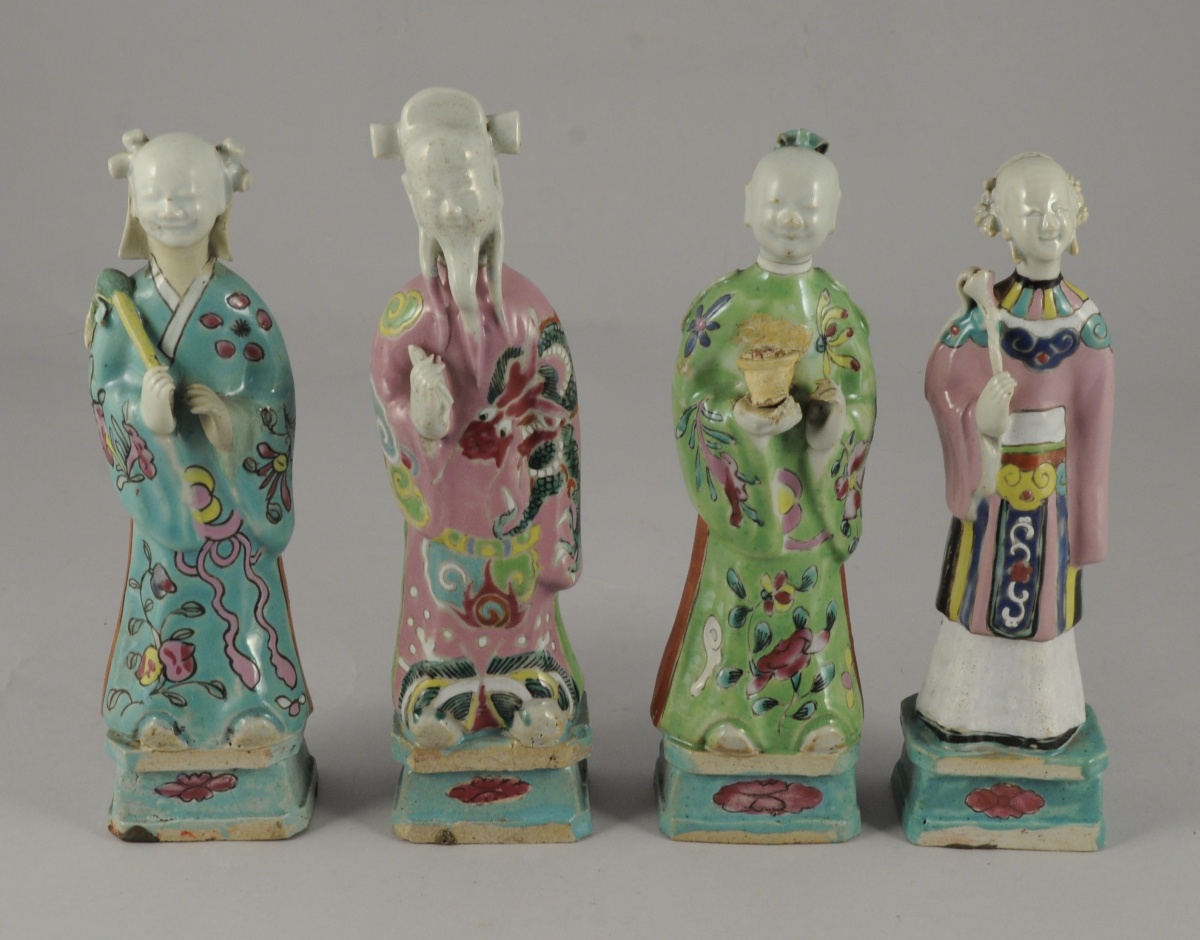 HUIT STATUETTES en porcelaine aux émaux de la famille rose représentant des personnages. Chacune percée à l'arrière de la tête. Chine, vers 1800. Haut. de 20 à 24 cm.