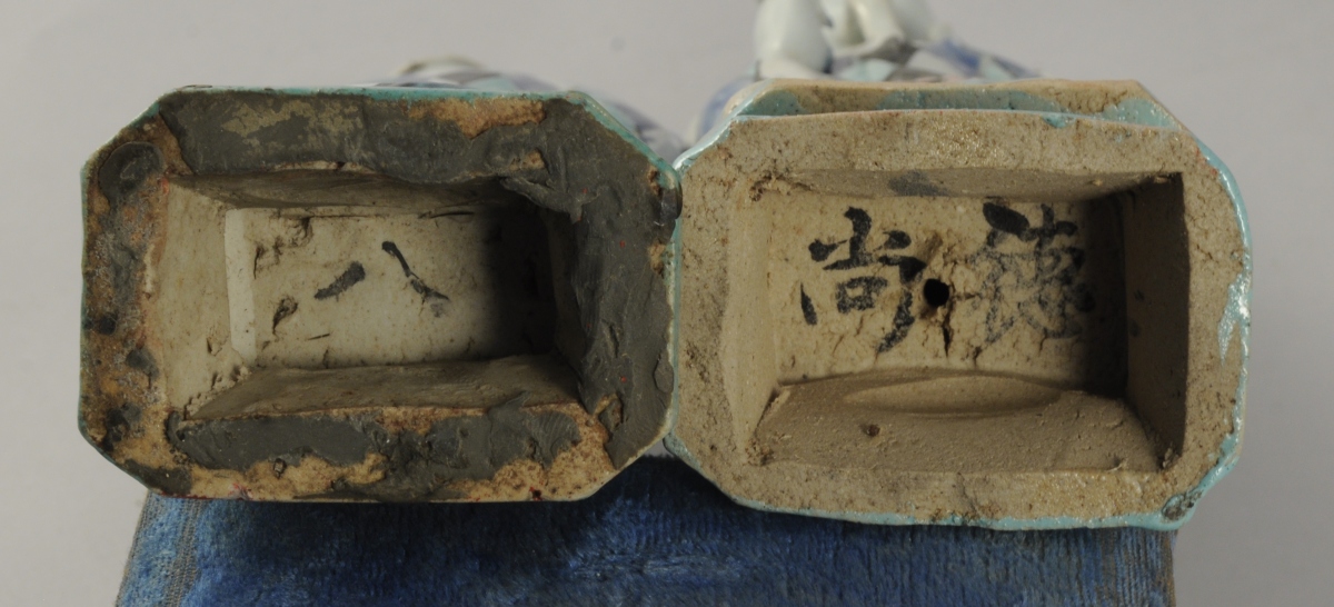 TROIS STATUETTES en porcelaine aux émaux de la famille rose représentant des arlequins. Chacune percée à l'arrière de la tête. Chine, vers 1800. Haut. 23,5 cm.