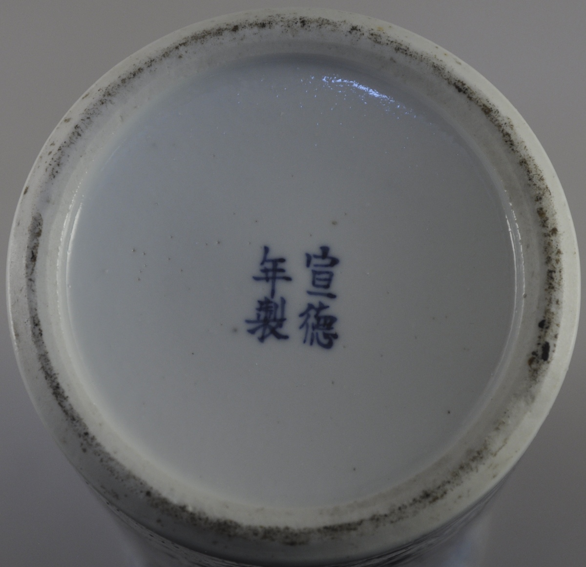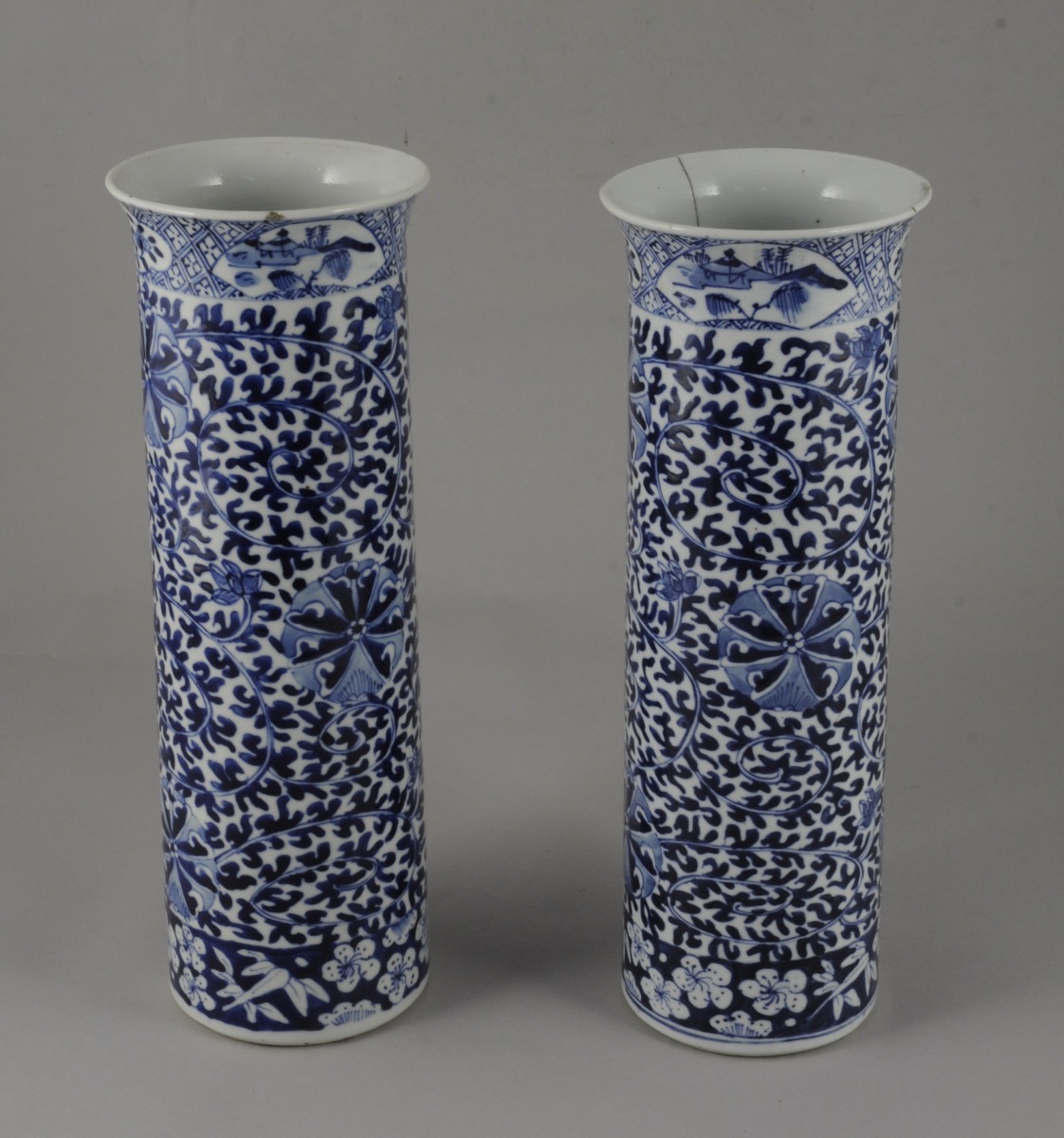 CHINE. Paire de vase rouleaux en porcelaine bleue et blanche. Marque apocryphe de Xuande. XIXème. Haut. 31 cm. (un égrené, l'autre accidenté et restauré).