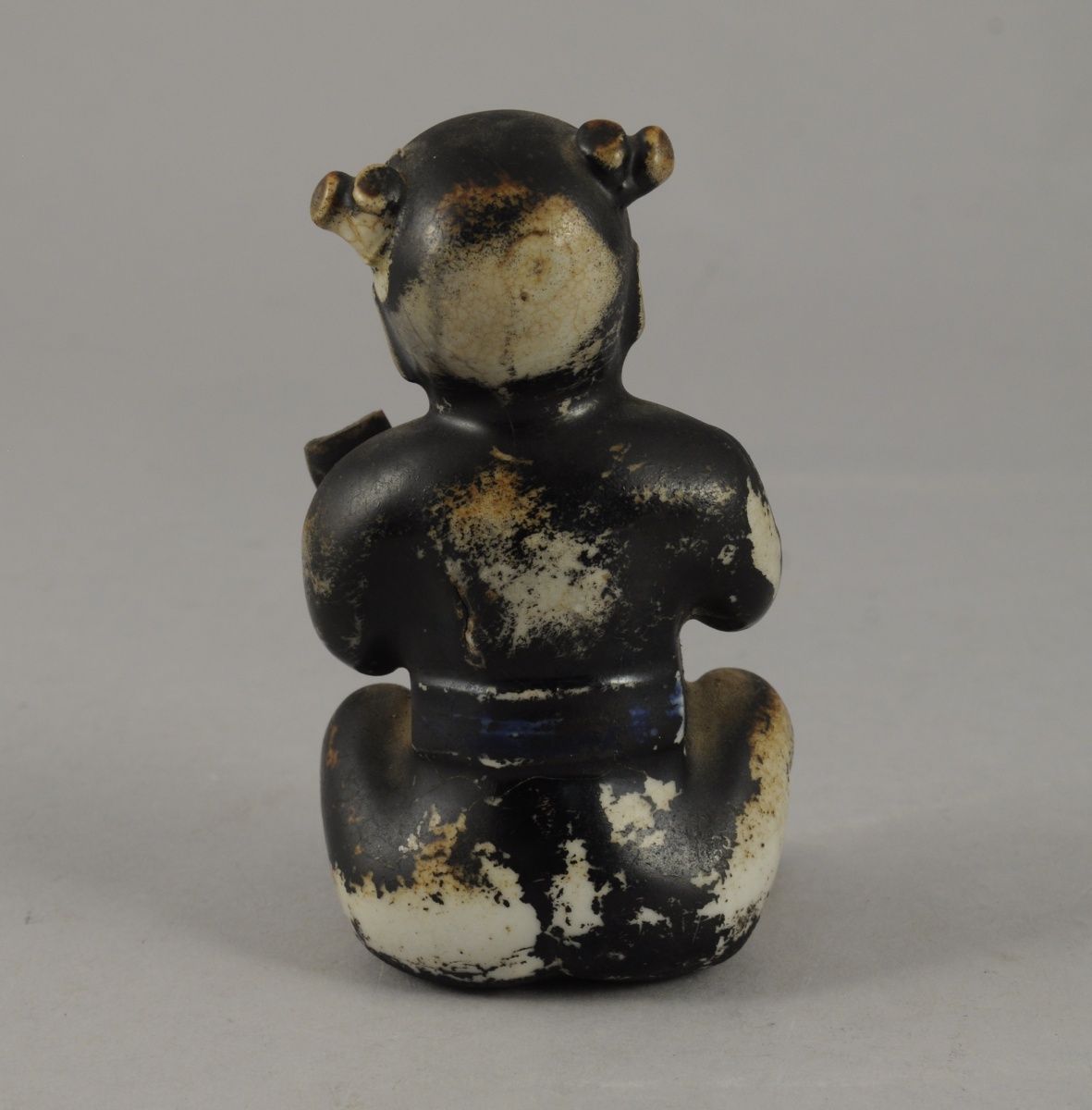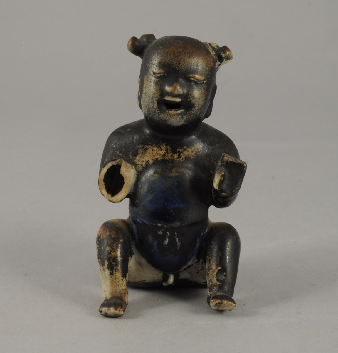 PETIT BOUDDHA en porcelaine émaillée brun et bleu. Chine, XIXème. Haut. 11 cm. (manques, usures)