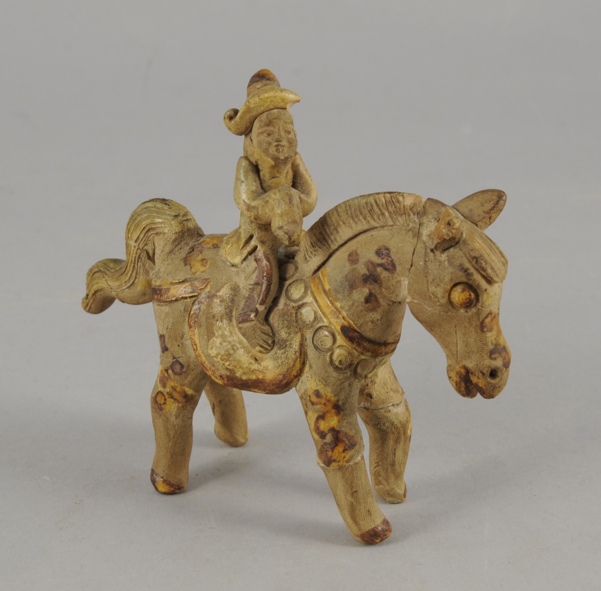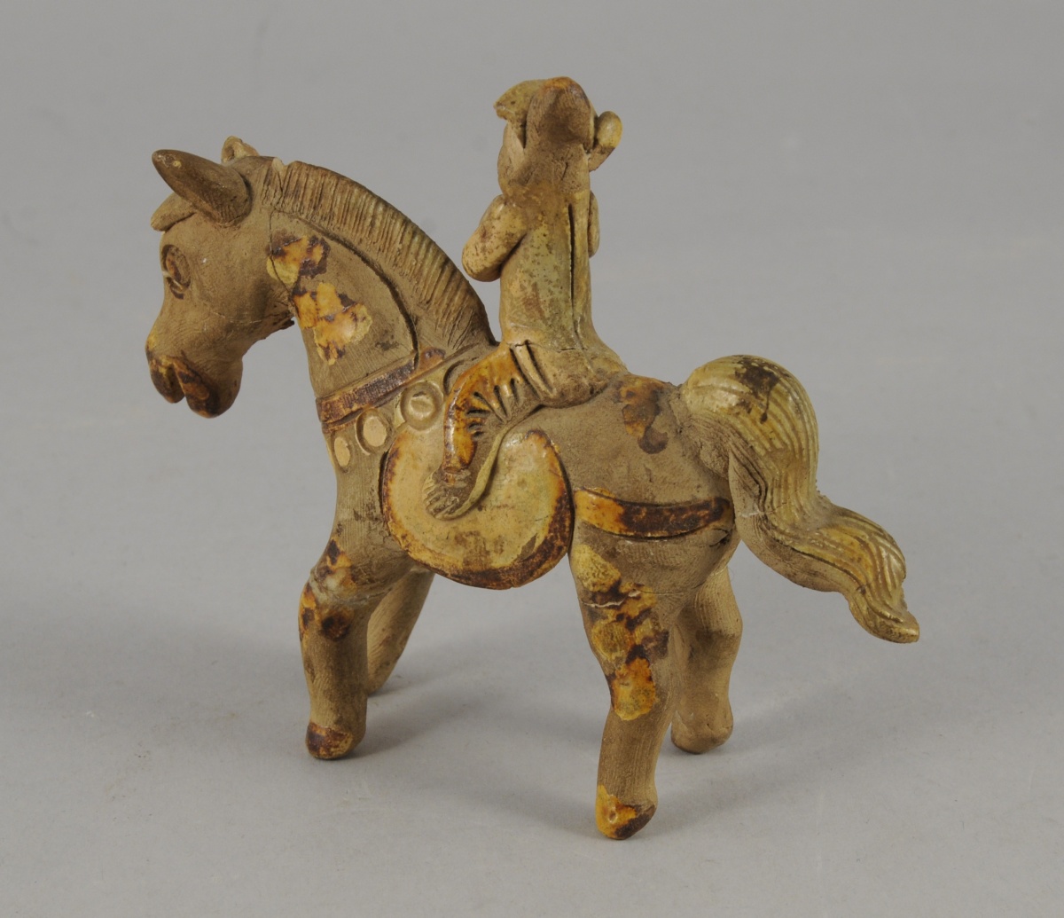 CAVALIER en terre cuite. Chine, travail moderne. Haut. 10, Long. 12 cm. (restaurations)