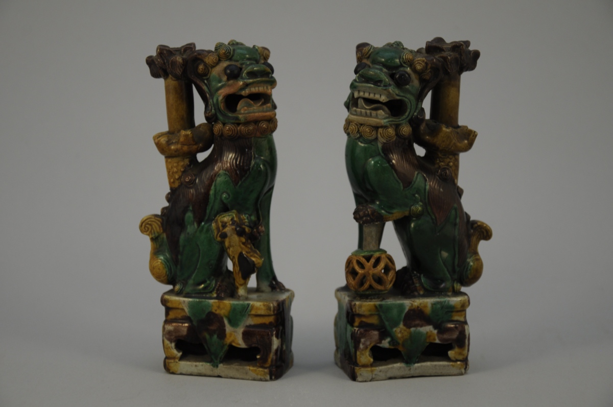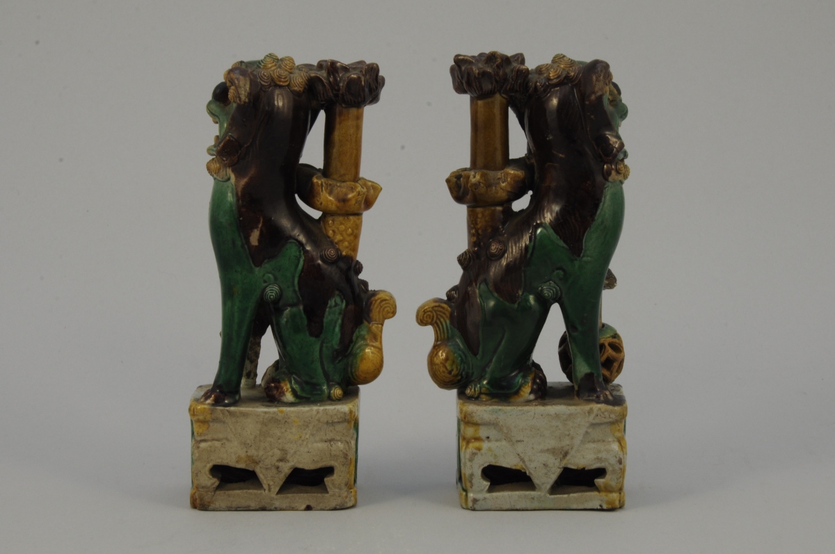 COUPLE DE CHIMÈRES formant porte baguettes d'encens en porcelaine émaillée jaune, vert et manganèse. Chine époque Kangxi. (Restauration et petit manque). H. 15,2 cm.