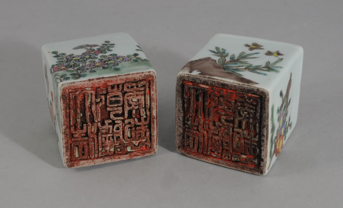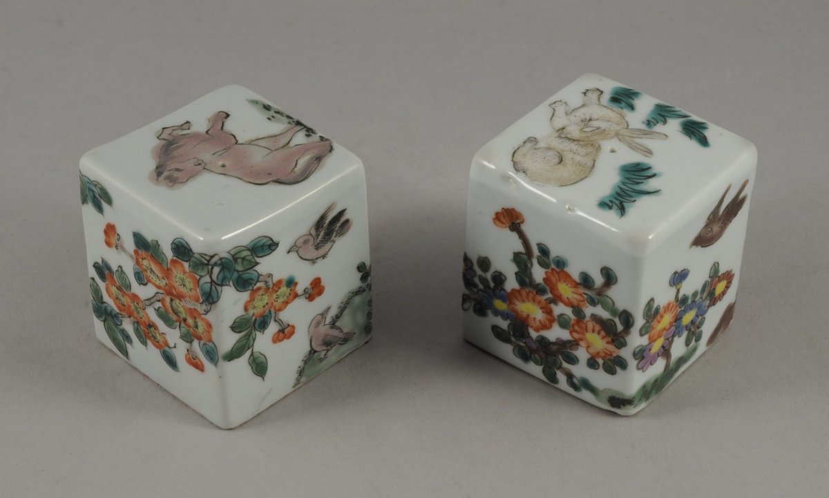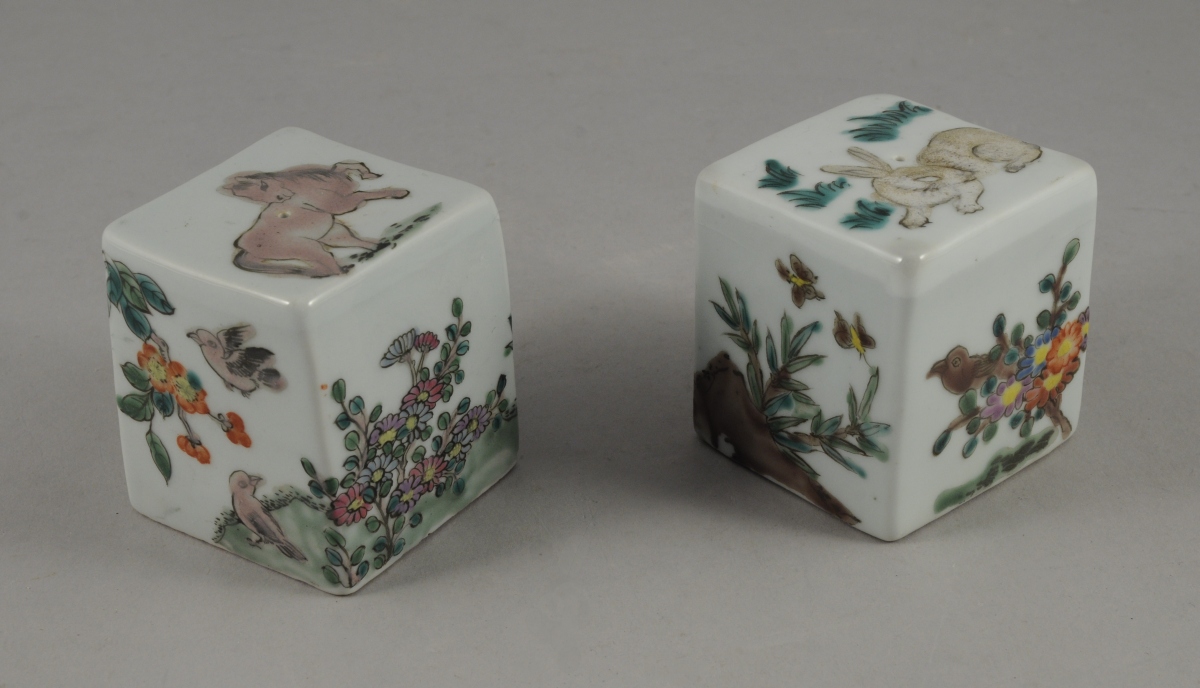 Paire de SCEAUX de forme cubique en porcelaine à décors peint d'un lapin et d'un cheval. CHINE. XXème. Haut. 6,5 Larg. 5,5 Prof. 5,5 cm.