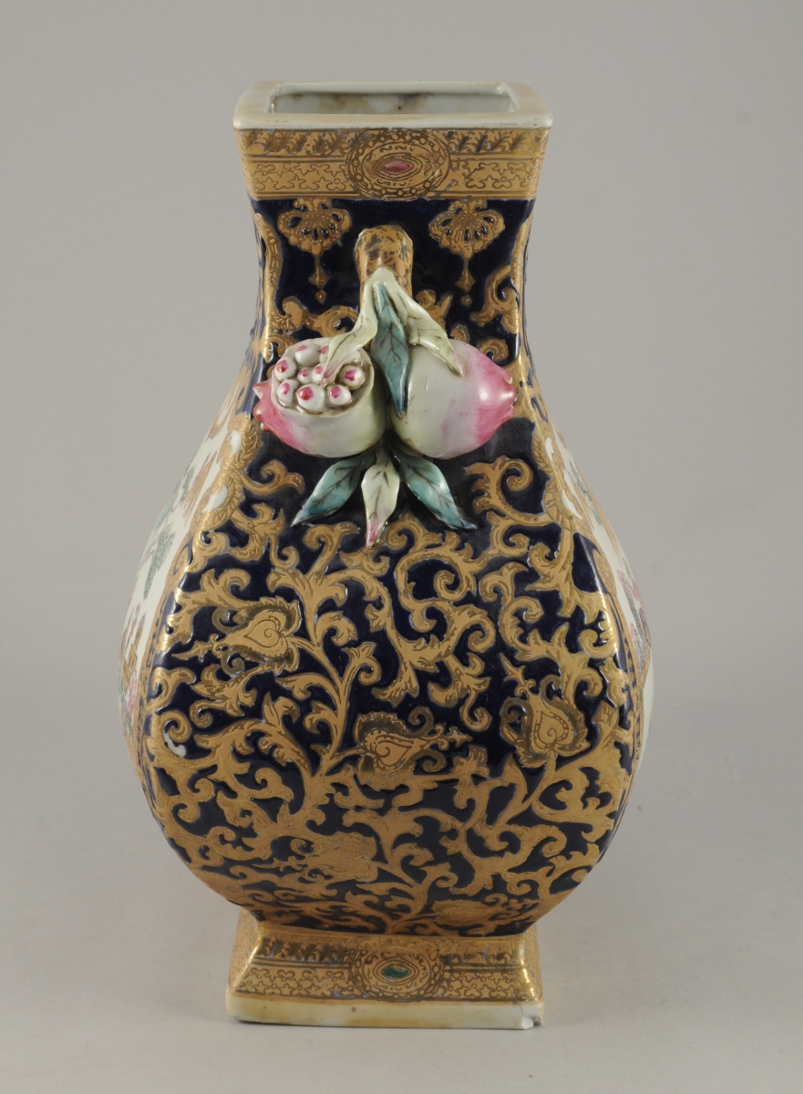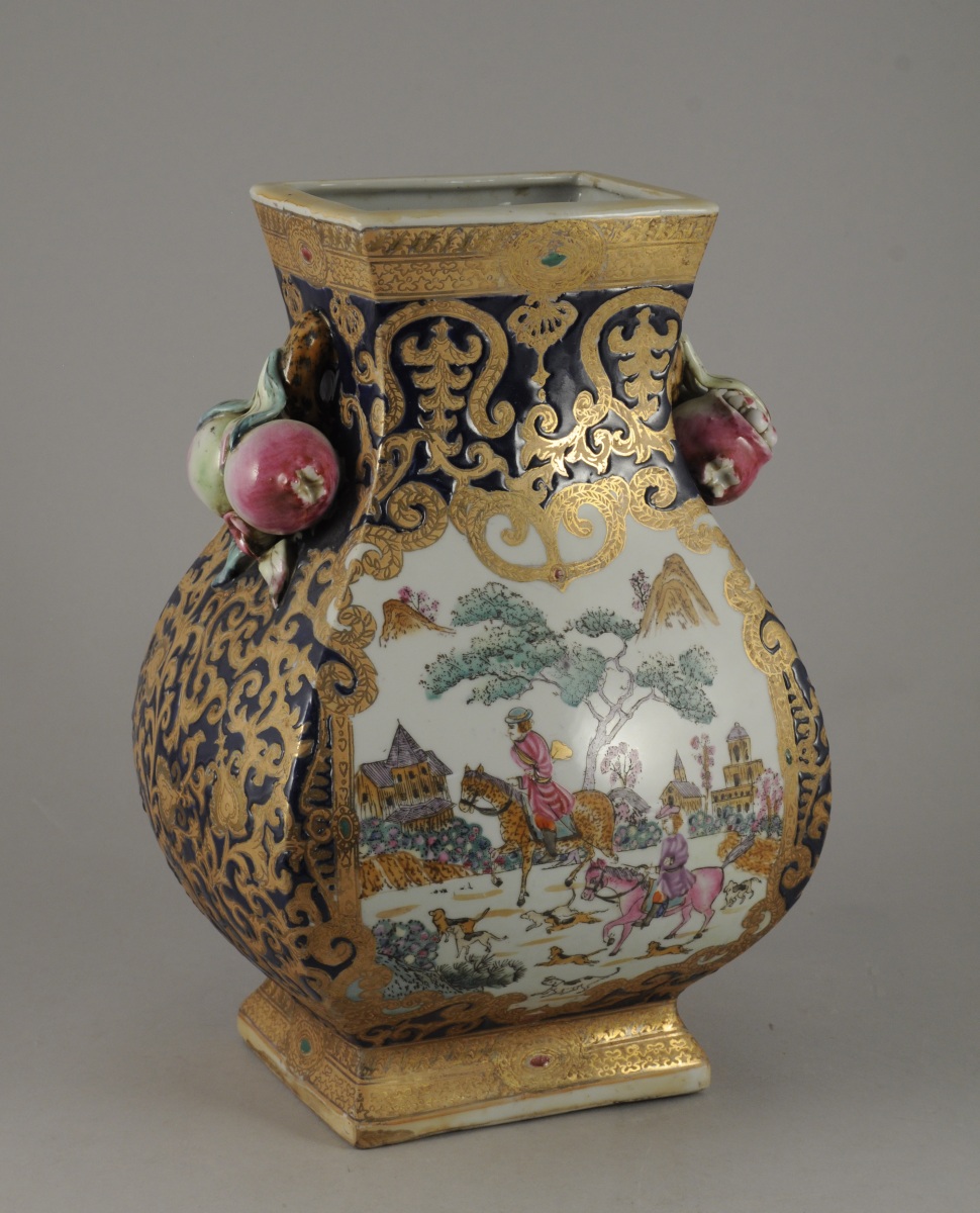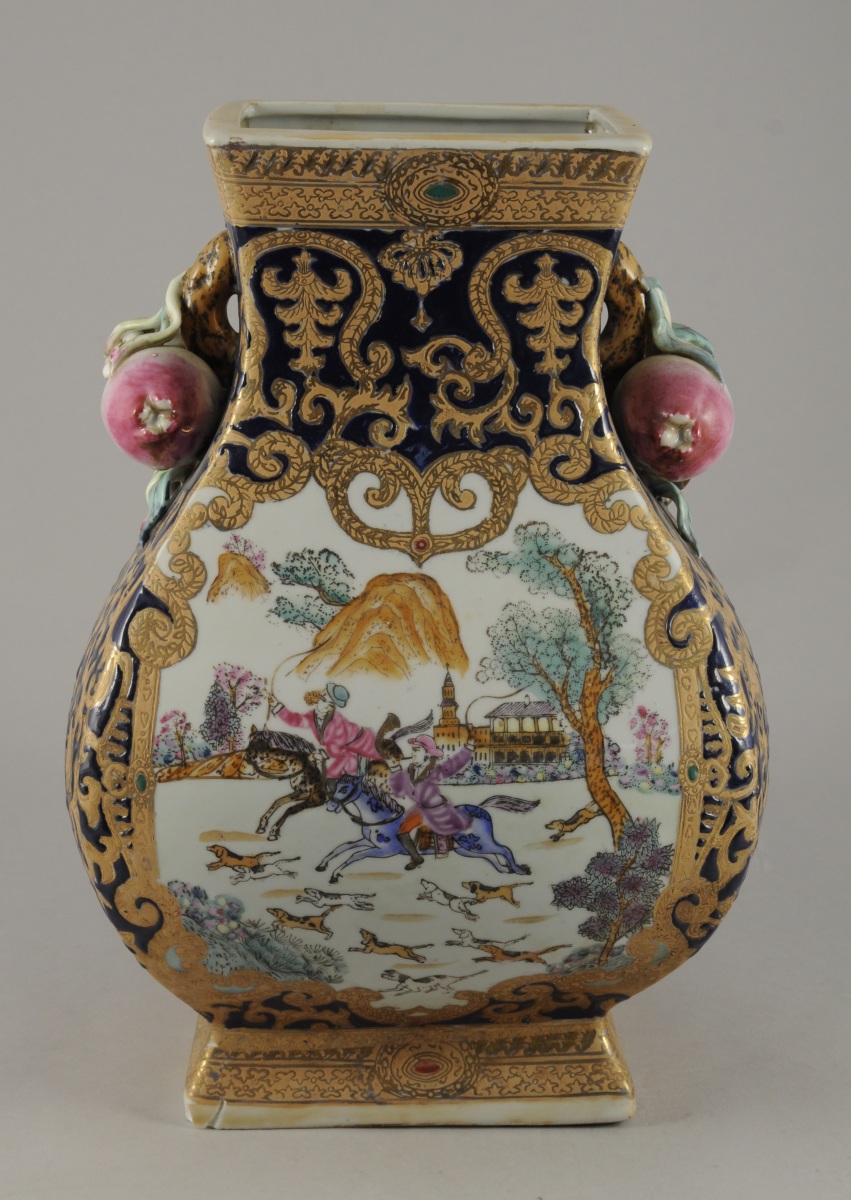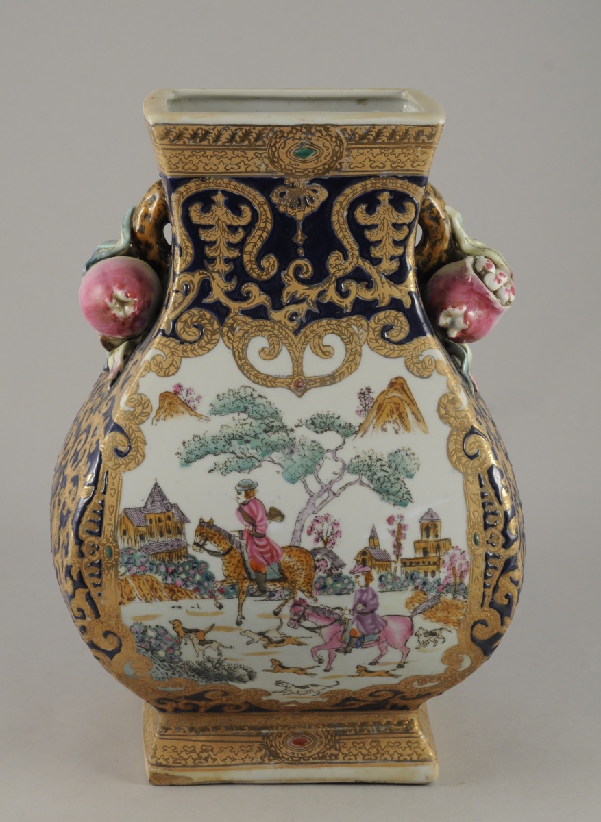 VASE en porcelaine à décor polychrome de chasseurs sur fond de paysage, dans le goût de la Compagnie des Indes. Anses décorées de grenades. Chine, XXème. Haut. 35 cm.