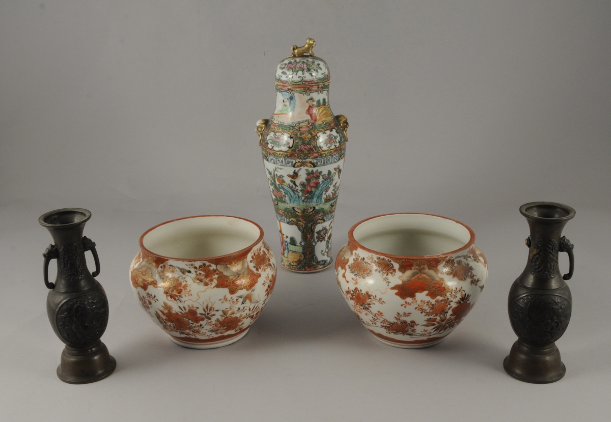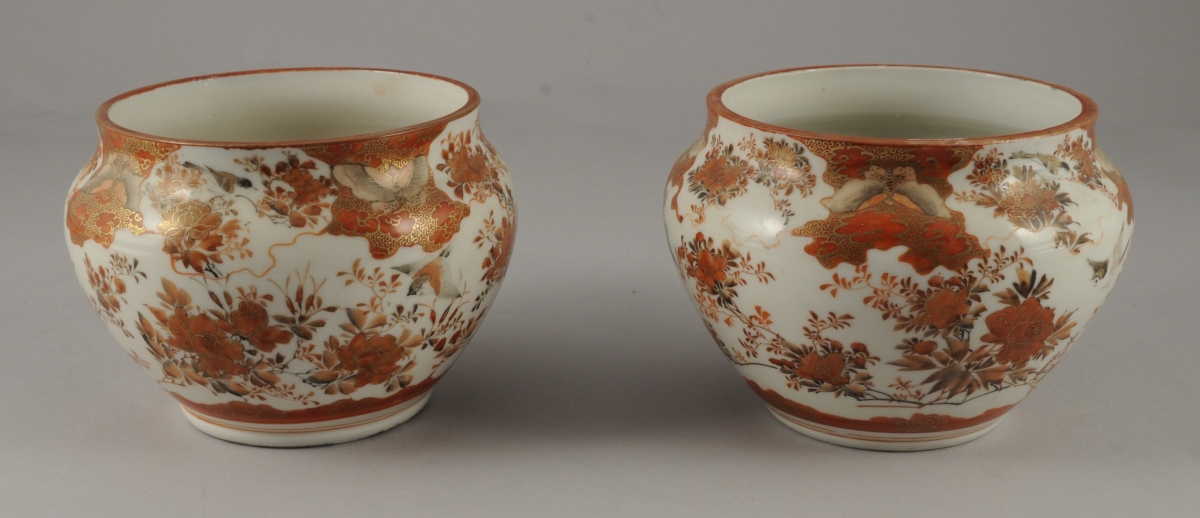 -SATSUMA. Paire de POTS circulaires en porcelaine, à décor de fleurs, d'oiseaux et de papillons. Marque à trois caractères au revers. Japon, fin XIXème. Haut. 11 cm.