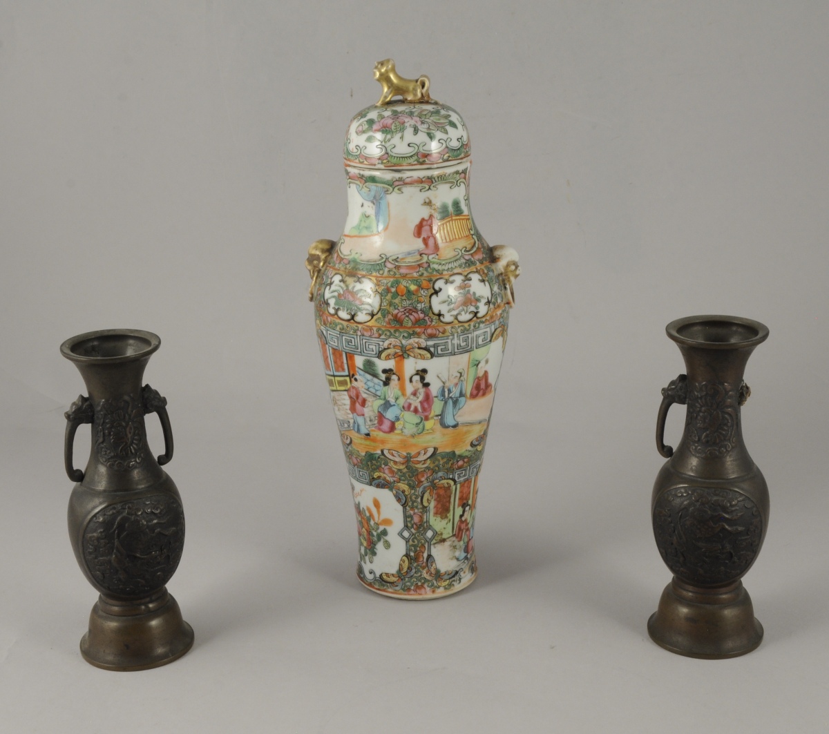 -CANTON. VASE couvert en porcelaine, à anses en forme de têtes de lions. Décor polychrome de personnages et oiseaux dans des réserves. Chine, fin XIXème. Haut. 28,5 cm. (accidents)