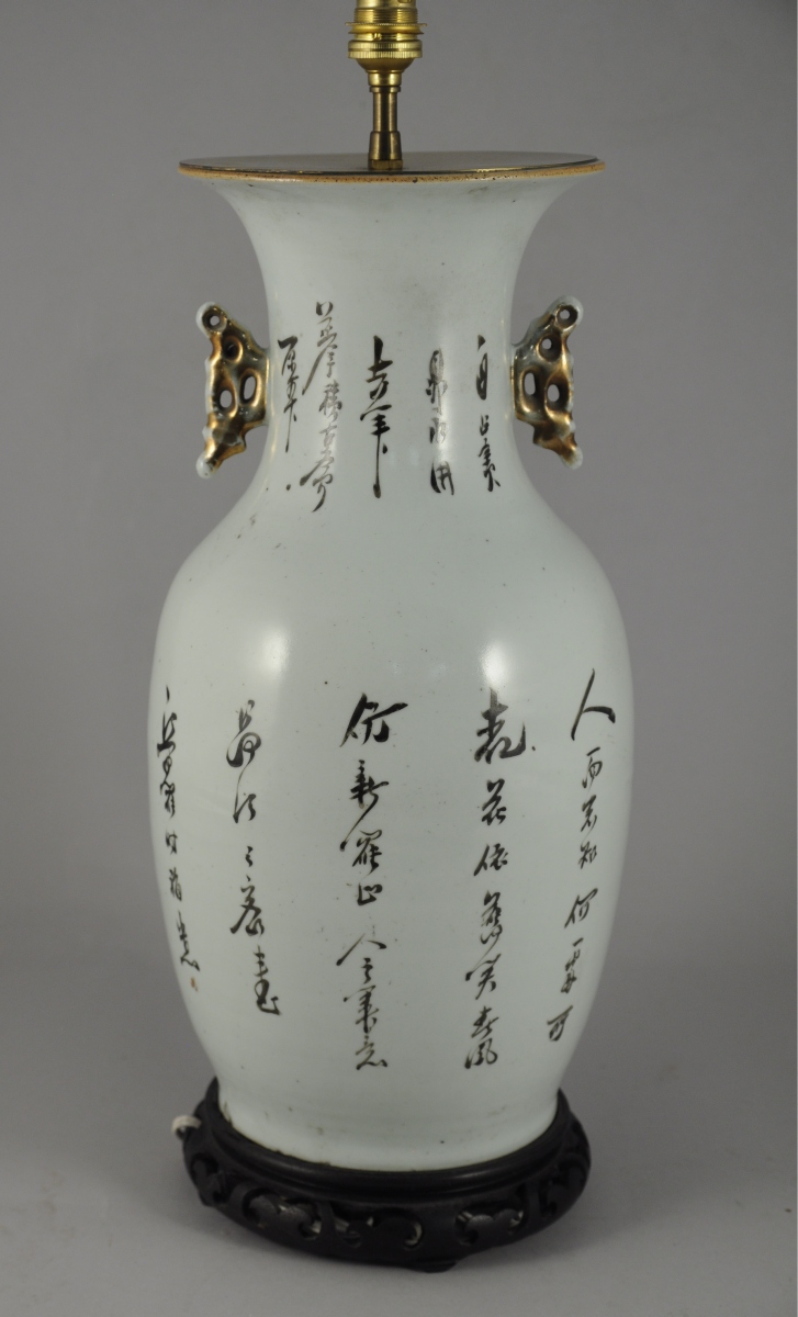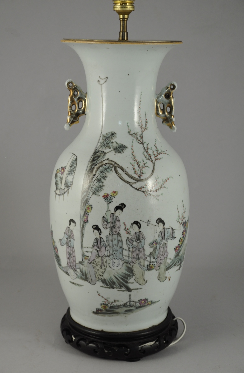 VASE en porcelaine monté en lampe à décor polychrome de personnages féminins dans un paysage. Chine, XXème. Haut. 45 cm.