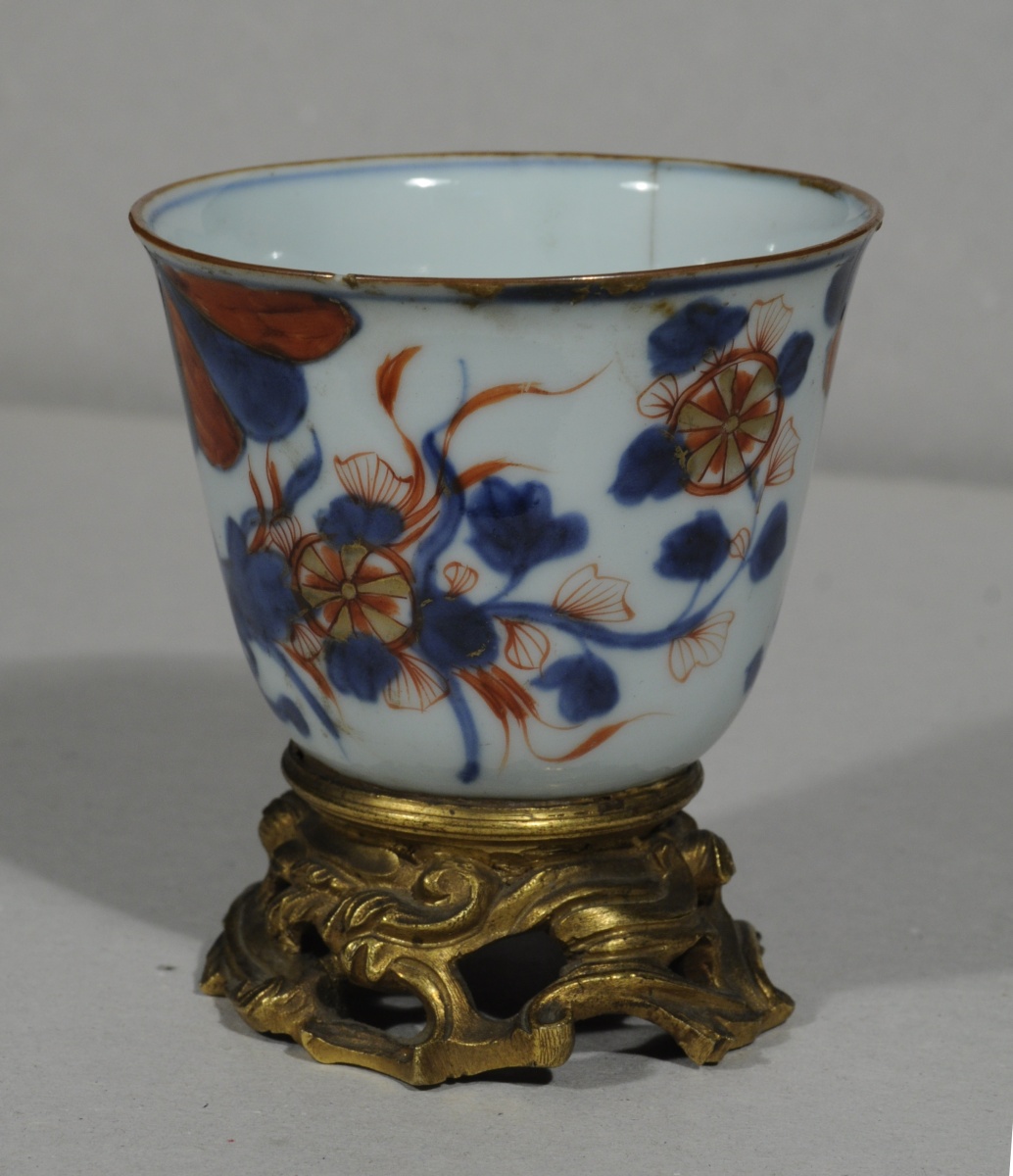 SORBET en porcelaine à décor Imari bleu, rouge et or de pivoines, feuillages et motifs rayonnants. Filets bleu et ocre sur le bord. Chine, XVIIIème siècle. Monture en bronze doré ajouré de rinceaux de style rocaille. Haut. 9, Diam. 8 cm. (fêles)