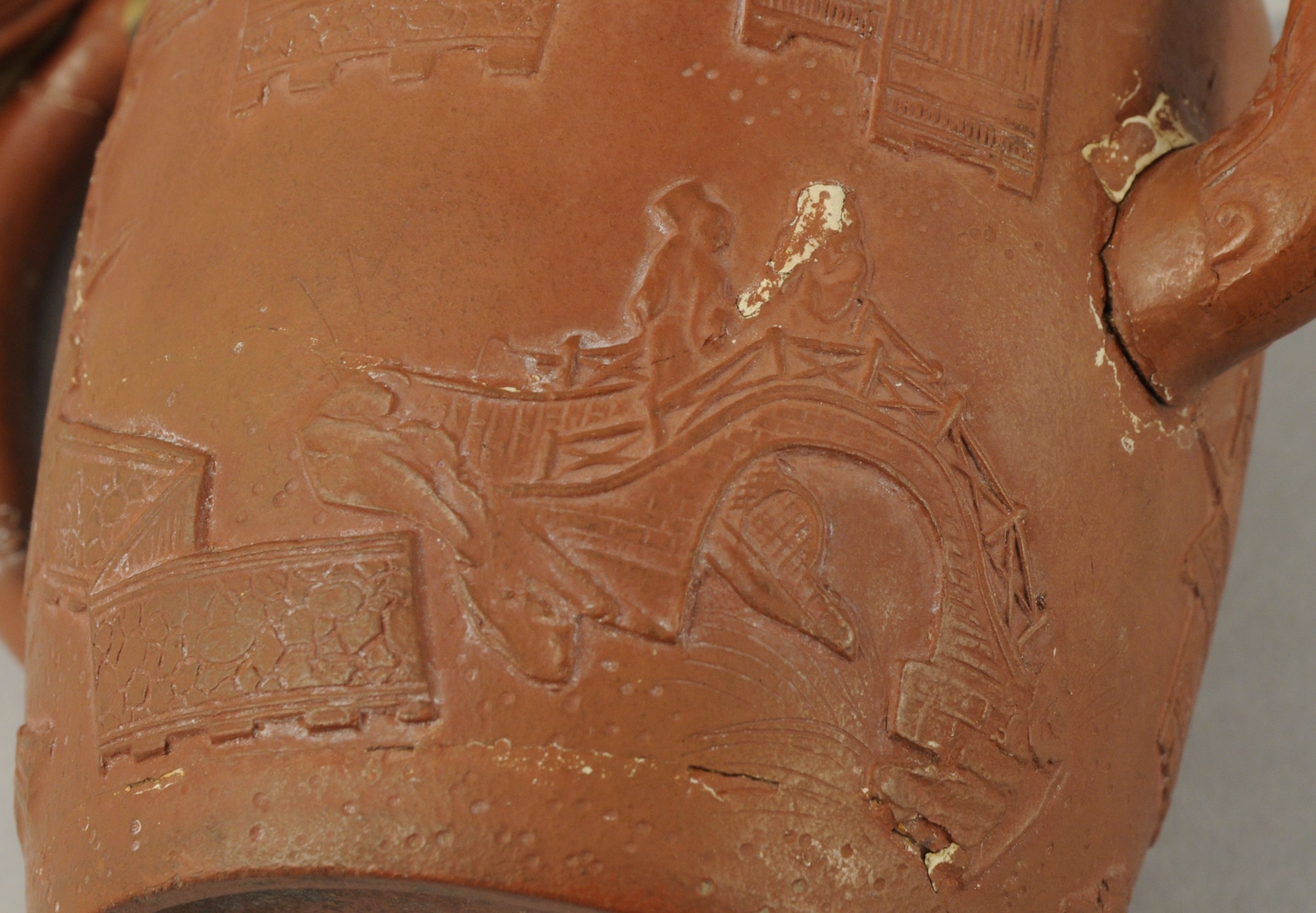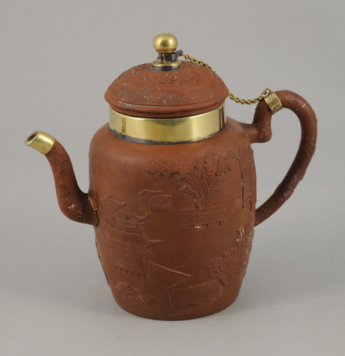 THÉIÈRE en grès de Yixing à décor en léger relief de jardins. Fretel, bagues et bec en métal doré. Chine, XIXème. Haut. 14,5, Larg. 16 cm. (manques et nombreuses restaurations)