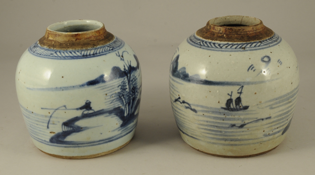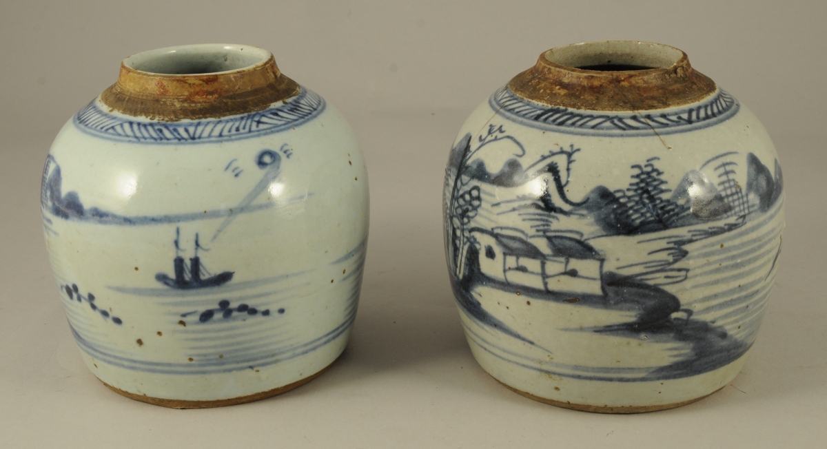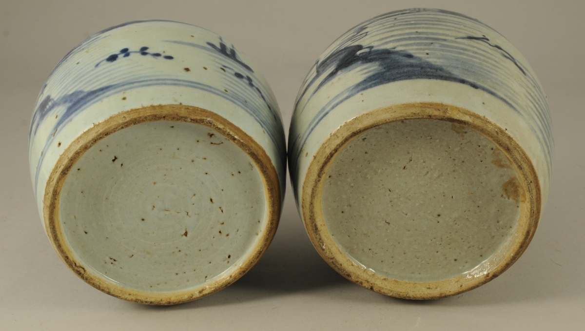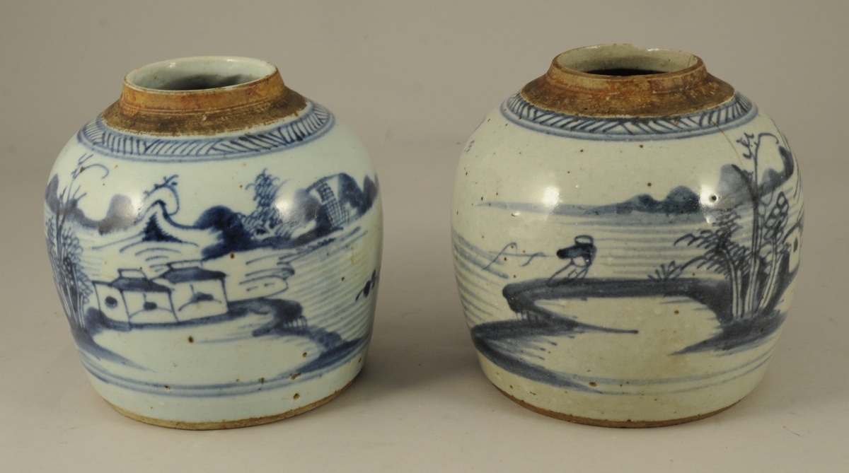 PAIRE de VASES pansus en grès porcelainé à décor bleu sur blanc d'une scène lacustre. Chine, XIXème. Haut. 15,5, Diam. 14 cm. (cheveux à l'un)