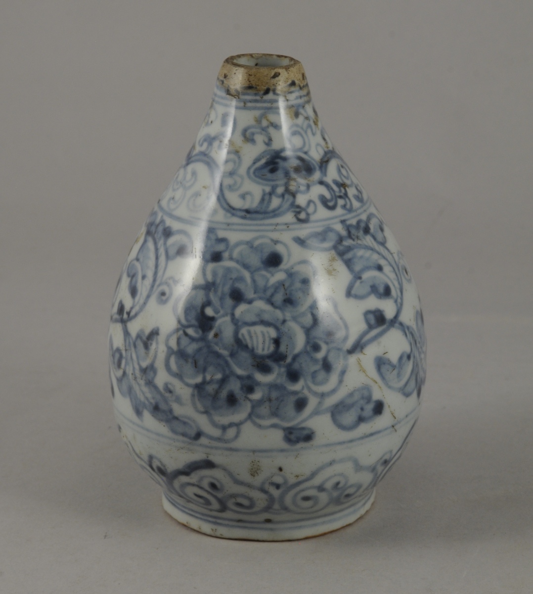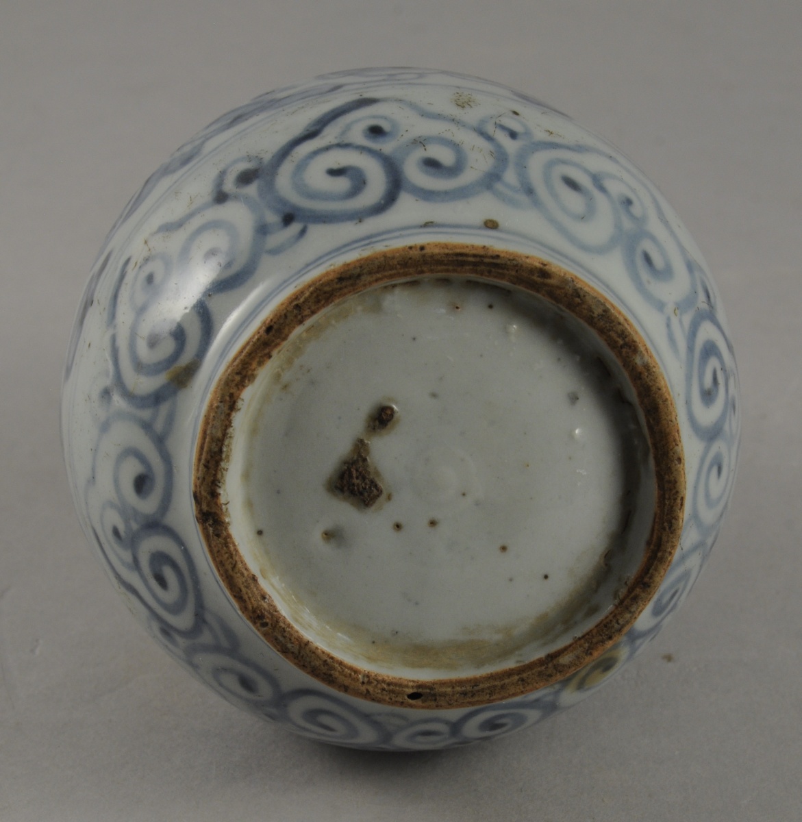 VASE BOUTEILLE en porcelaine à décor d'émaux bleus et blancs. Chine, XVIIème-XVIIIème. Col coupé. Haut. 13,7 cm.