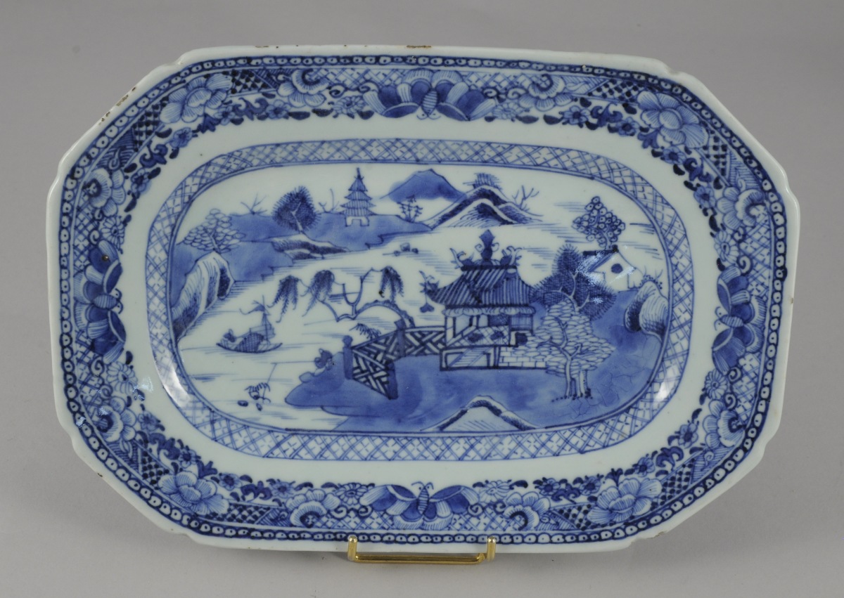 PLAT octogonal en porcelaine à décor en bleu et blanc d'un lac de montagne. Chine, XVIIIème. Long. 25, Larg. 17,5 cm.