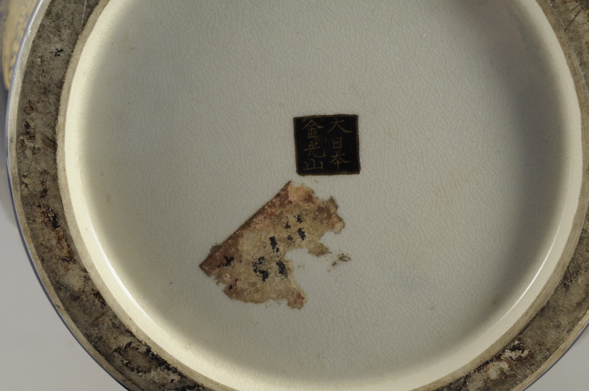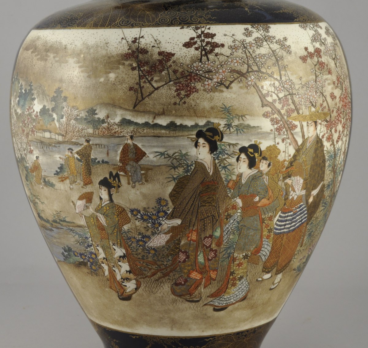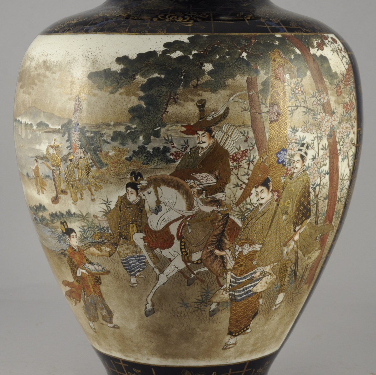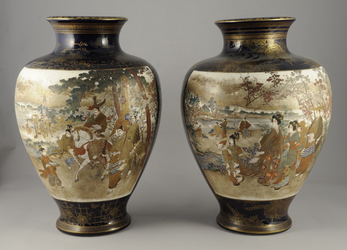 PAIRE de VASES en porcelaine du Japon dite Satsuma. Scènes de Cour : offrande à un Seigneur de Guerre et courtisanes aux éventails. Début du XXème. Haut. 46, Diam. 30 cm.