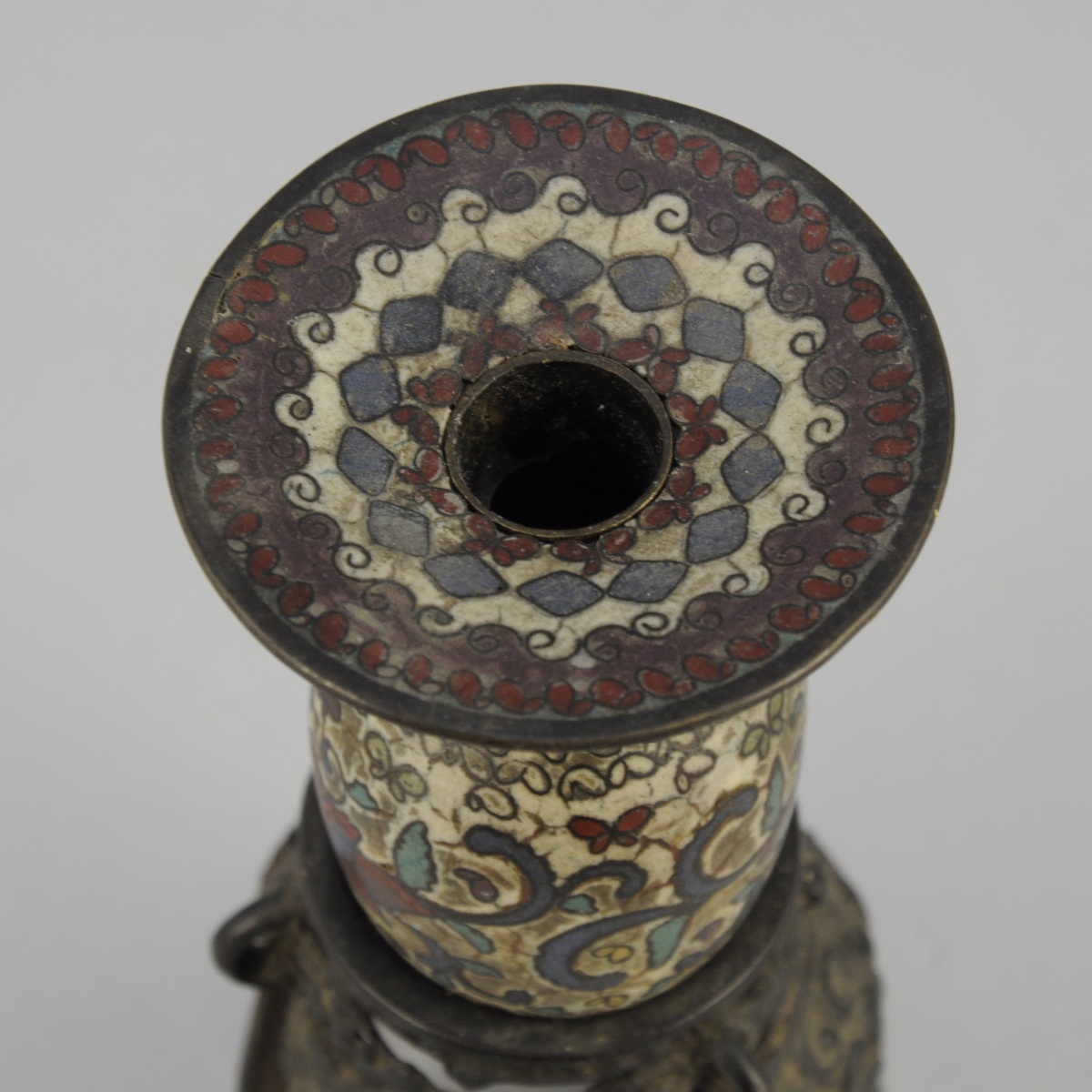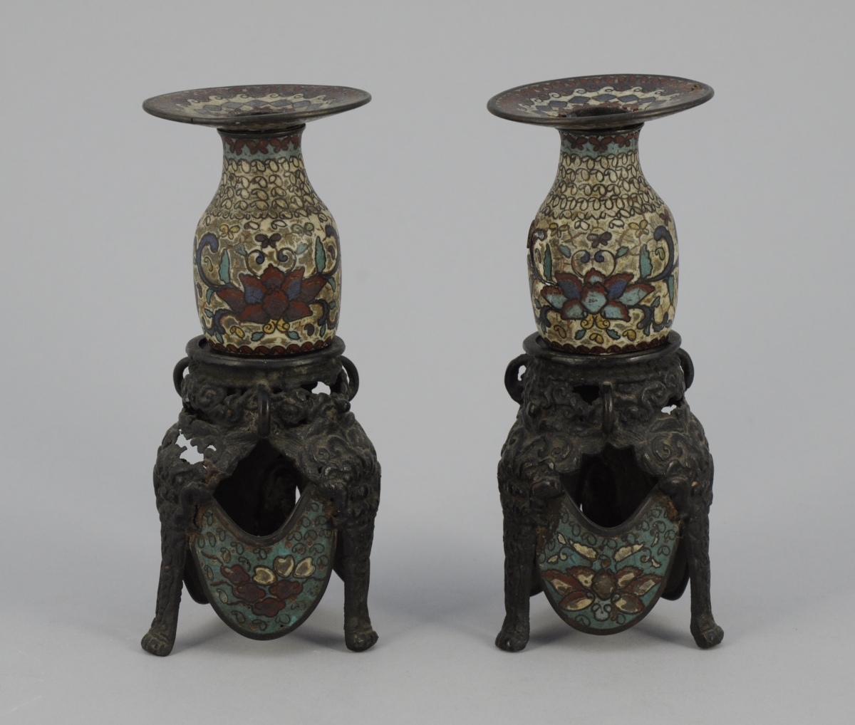PAIRE de VASES sur SELLETTES tripode en bronze et émaux cloisonnés. Japon, vers 1900. Haut. 15 cm. (accidents et manques à l'émail)