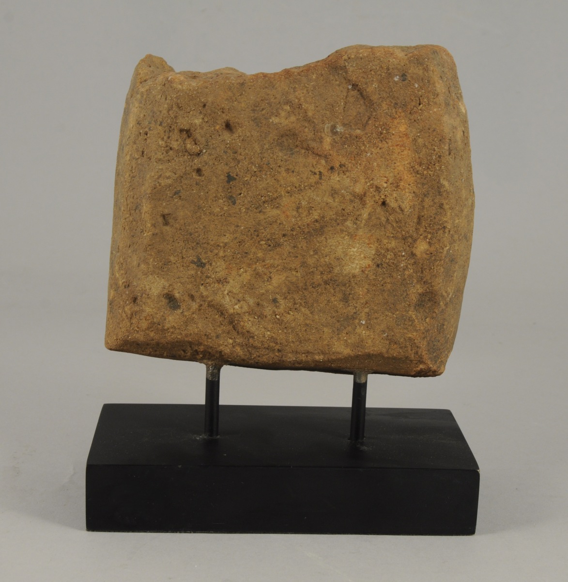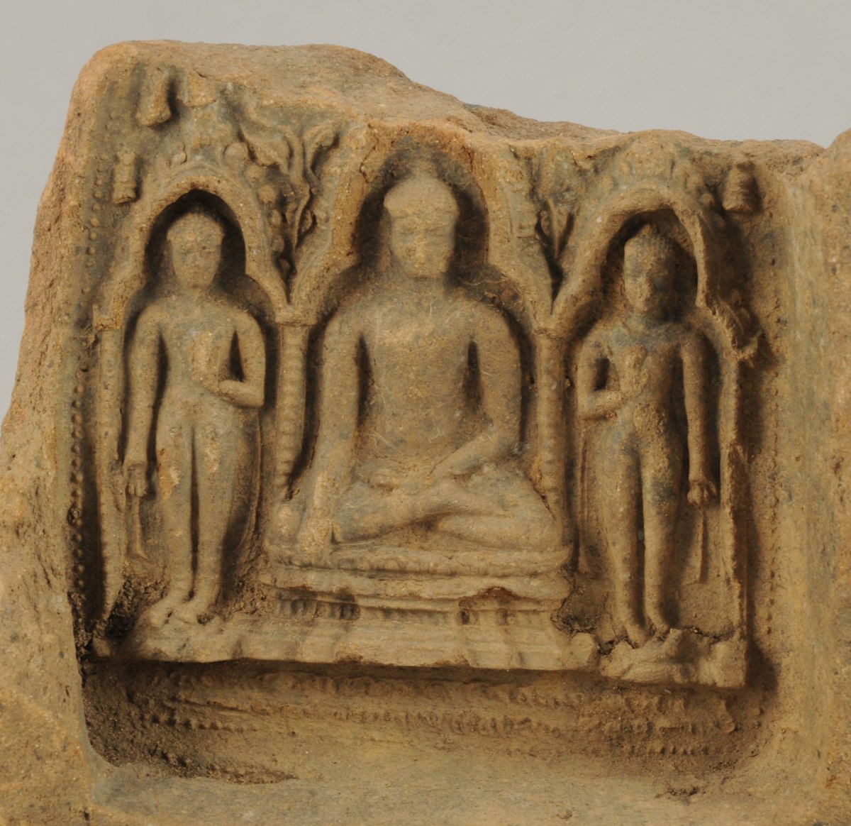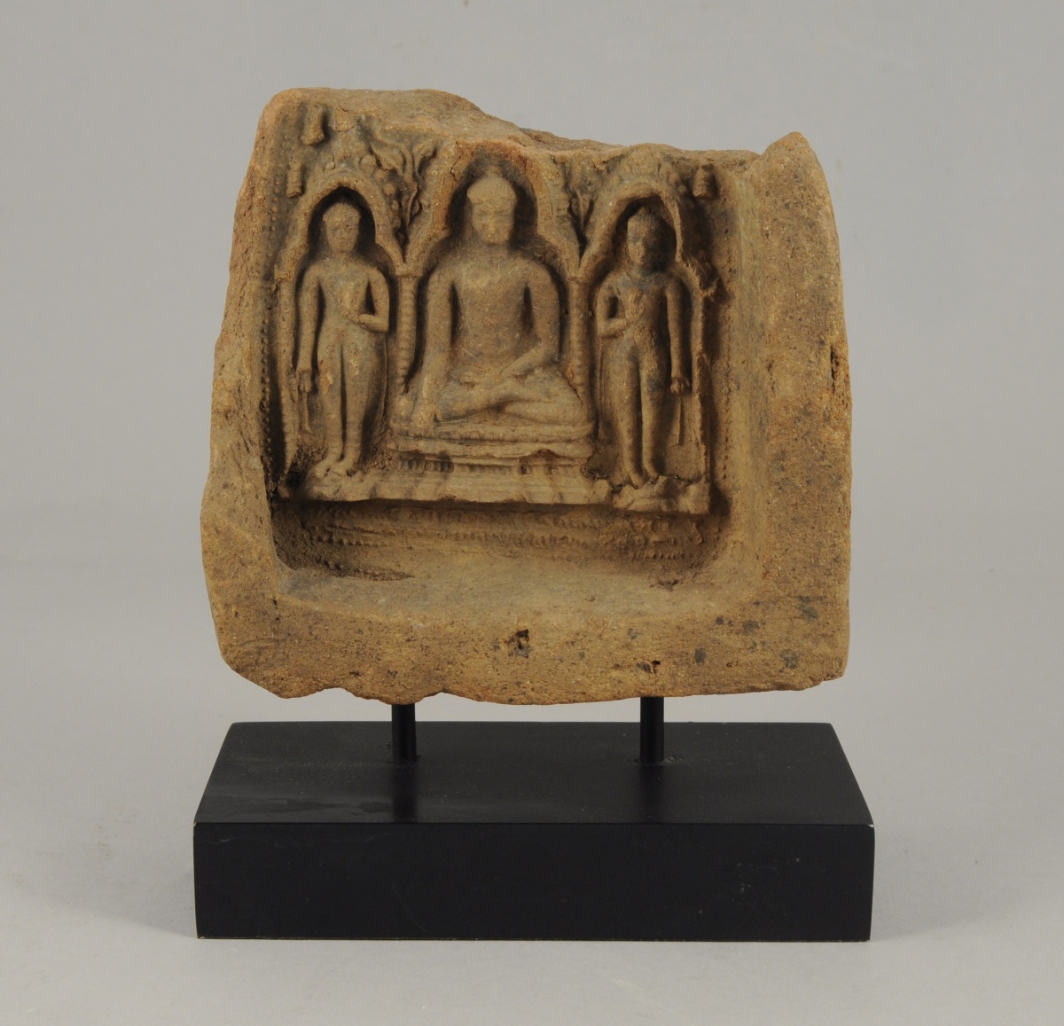 STÈLE en pierre sculptée en bas relief représentant une divinité boudhique. Haut. 15, Larg. 15 cm.