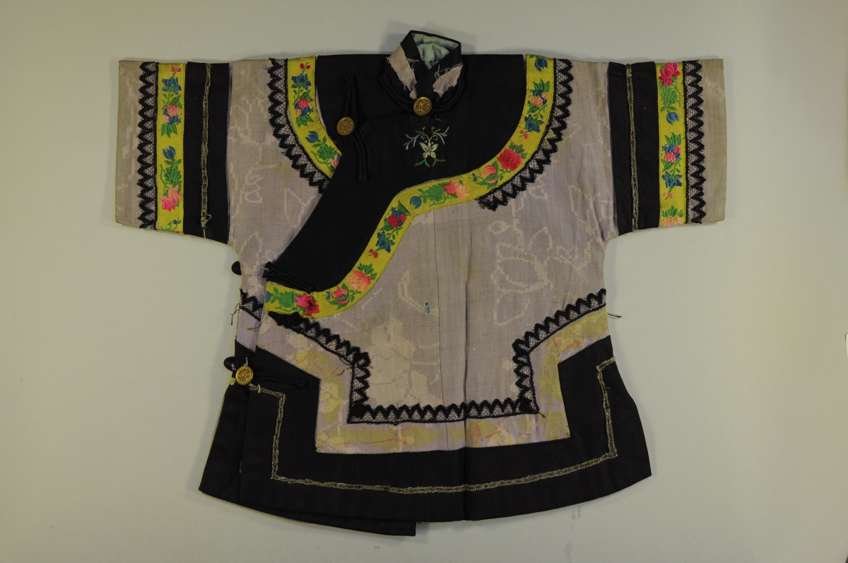 Deux pièces en tissé mauve et vert appliqué de satin noir, frises florales et dentelles