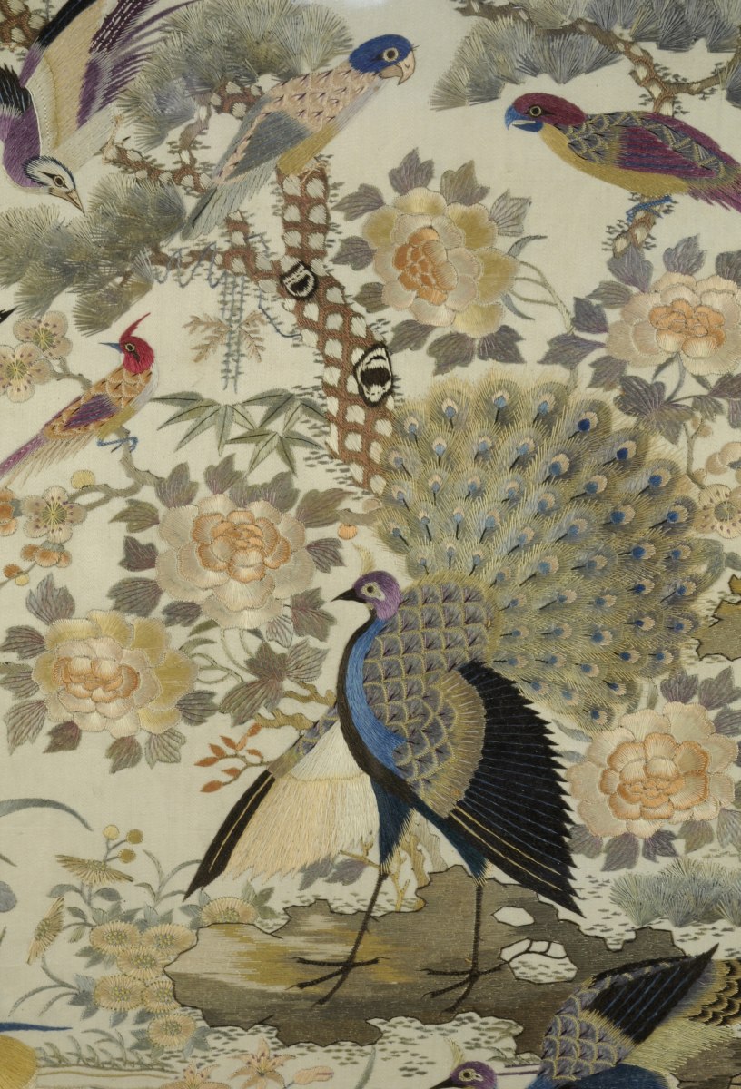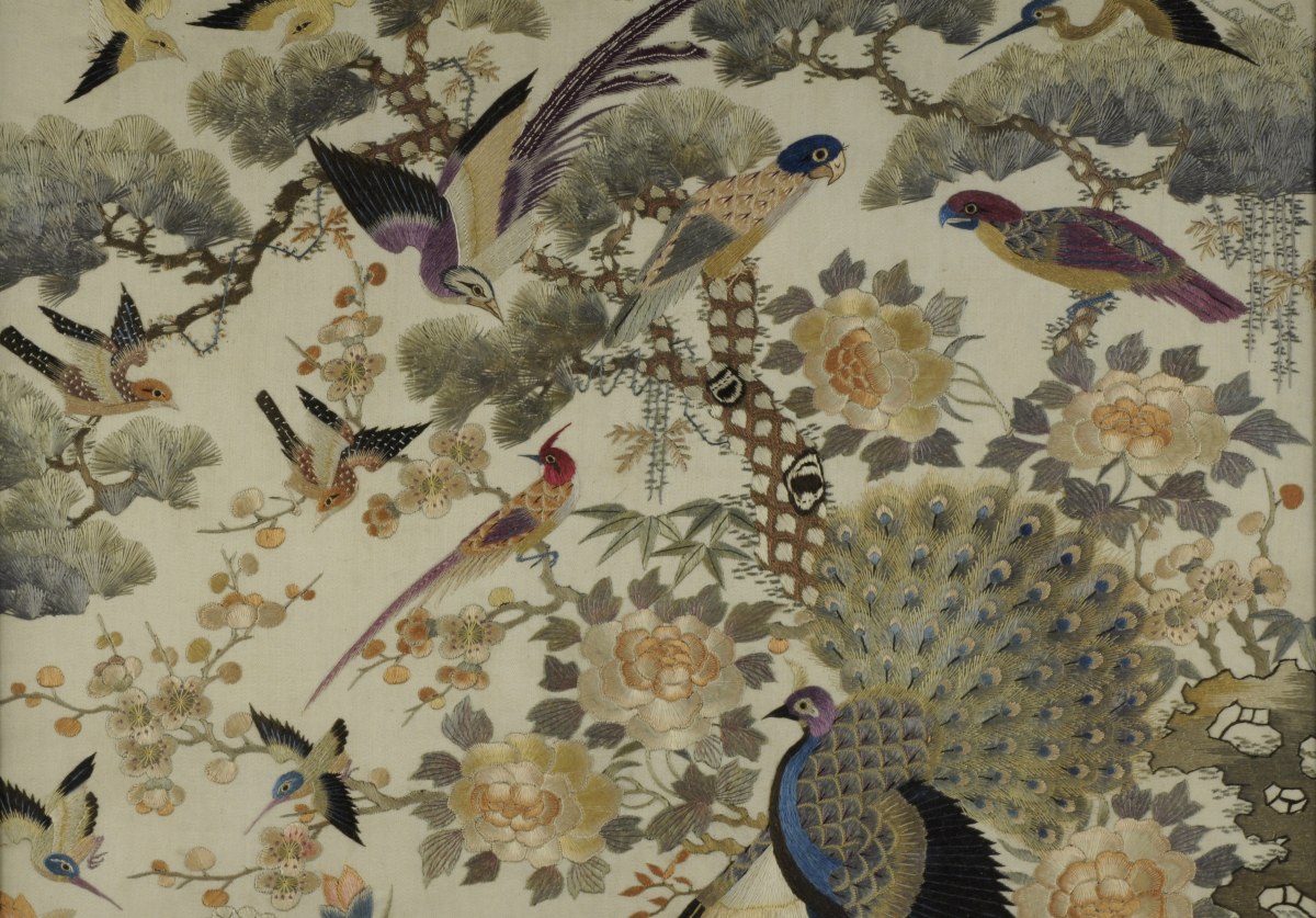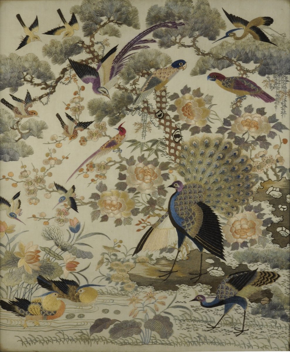 FRAGMENT DE PANNEAU de soie brodé. Paon, canards de Barbarie, martin-pêcheurs et autres oiseaux dans un jardin. Chine, fin XIXème. 43 x 35 cm.