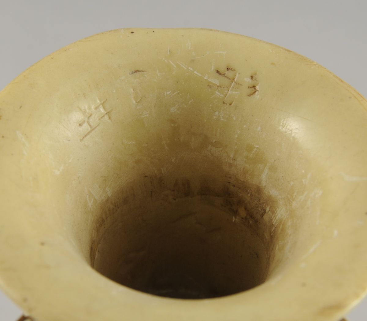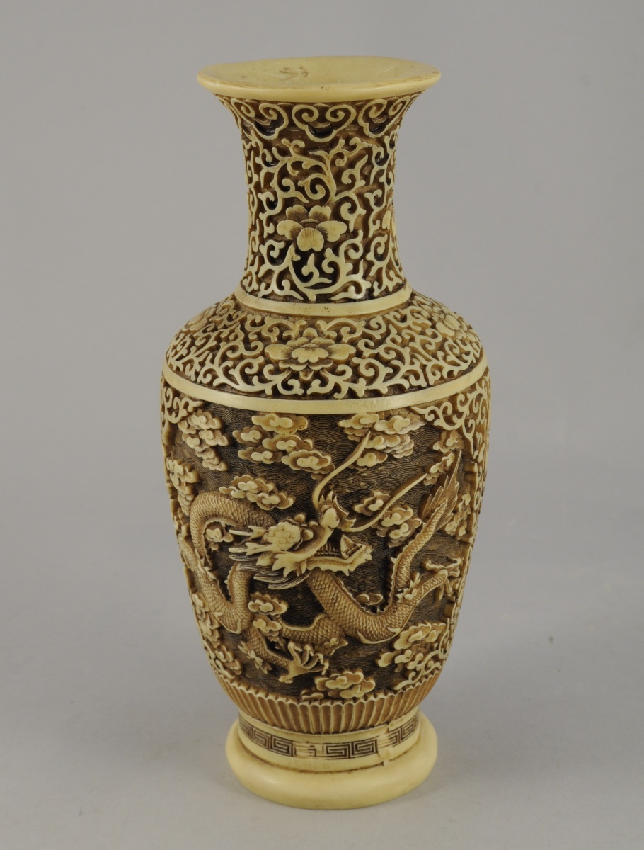 VASE BALUSTRE, en résine à motif sculpté de deux dragons à cinq griffes dans un entourage de fleurs stylisées. Chine, travail moderne. Haut. 26, Diam.10 cm.