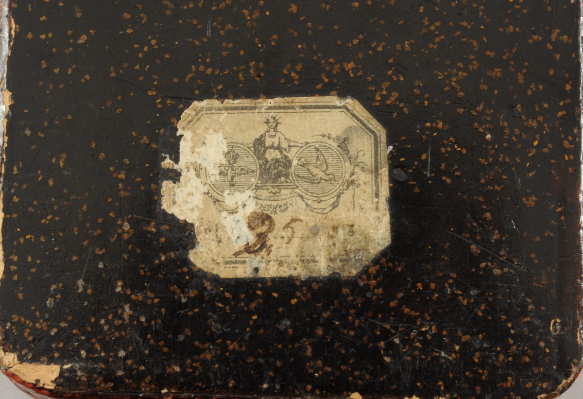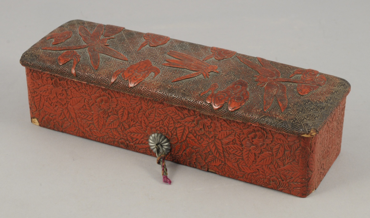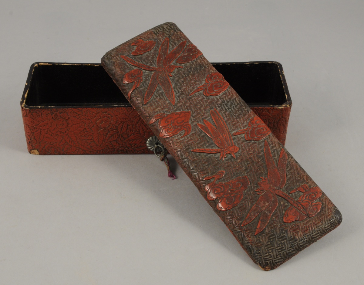 BOÎTE À PINCEAUX en laque rouge à décor de deux libellules et d'un grillon sur un fond de fleurs stylisées. Retenue par une cordelette. Japon, XIXème. Haut. 6, Larg. 24, Prof. 7,5 cm.