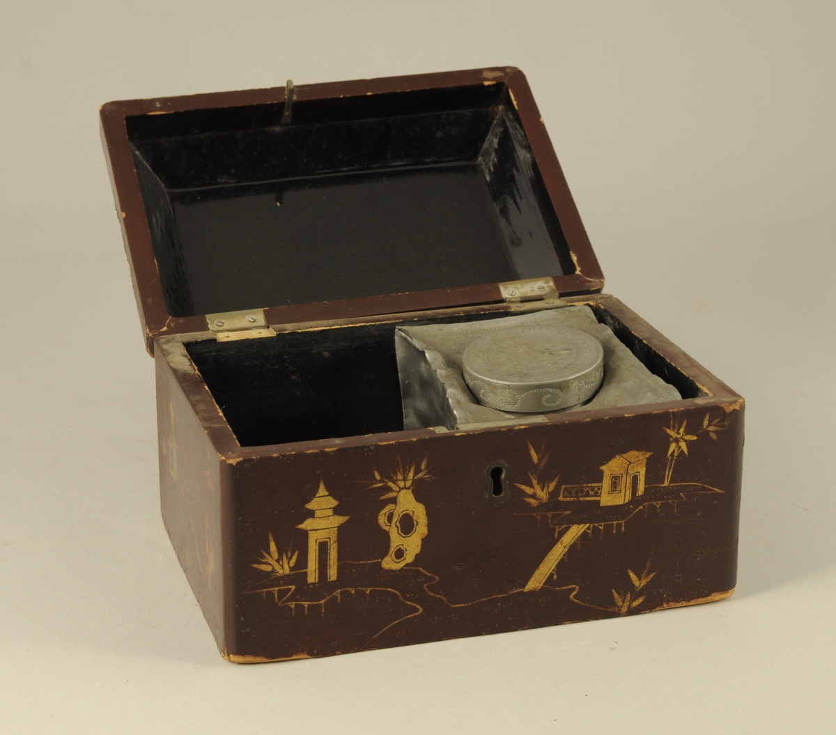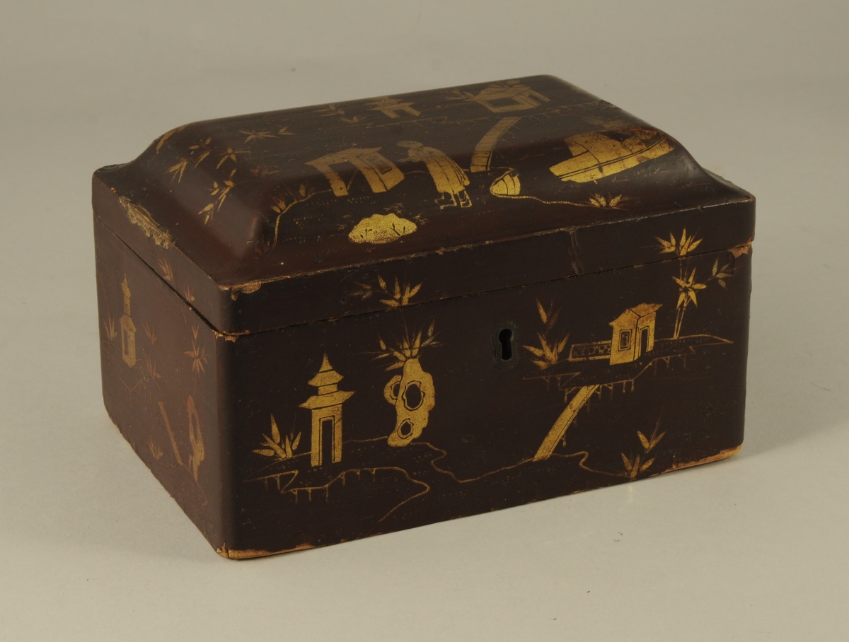 COFFRET à THÉ rectangulaire en laque or sur fond bordeaux à décor d'un paysage lacustre animé de pagodes et personnages. Il découvre un boîte à thé en étain estampé de fleurs et feuillages stylisés et volutes. Dans le goût de la Chine. Fin XIXème. Haut. 13, Larg. 20, Prof. 14 cm. (en l'état)
