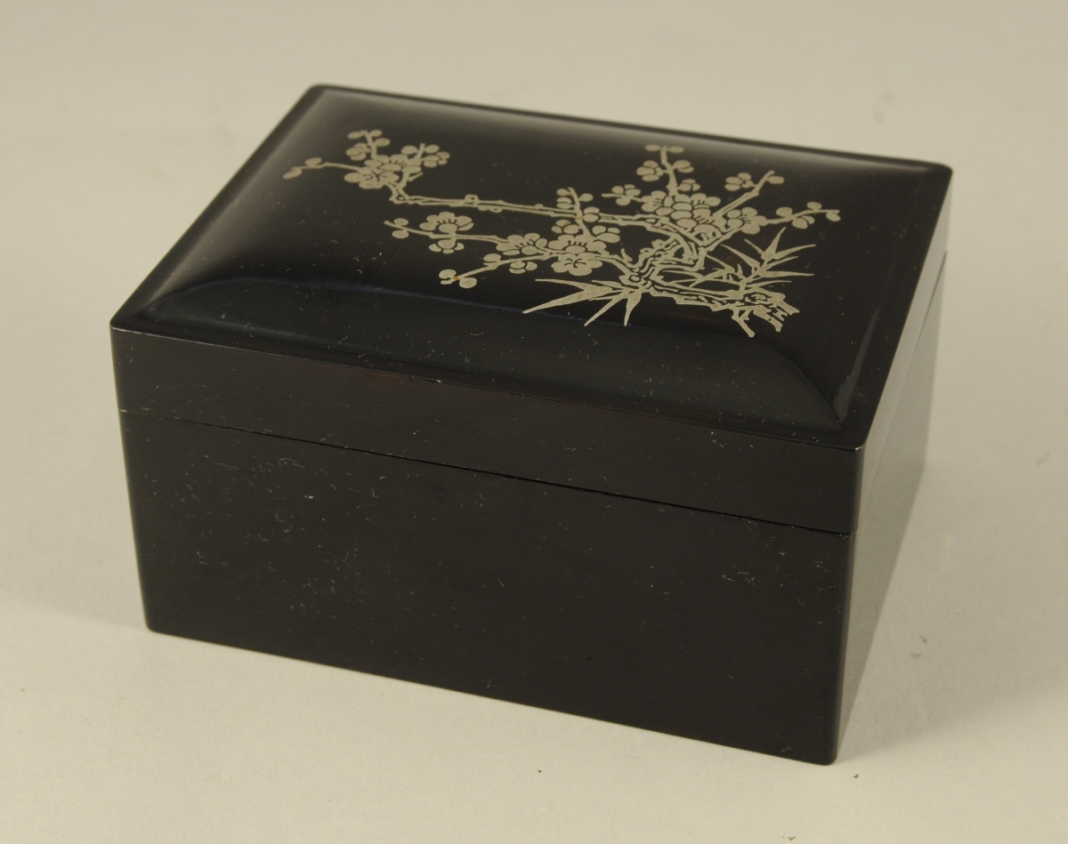 JOINT :BOÎTE à l'imitation du laque noire. Le couvercle à décor argenté de branches de cerisier. Haut. 7,5, Larg; 15, prof. 11 cm.