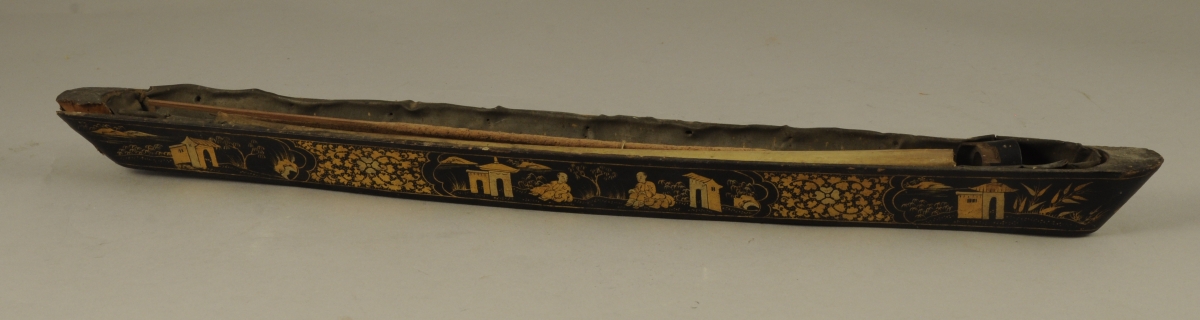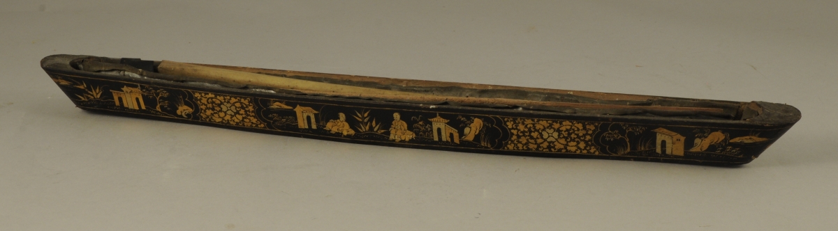 BRÛLE-ENCENS en bois en forme de jonque. Décor or sur fond noir, à l'imitation du laque, de personnages et d'habitations dans un paysage. Haut. 3, Long. 49,5, Prof. 4,5 cm.(accident, usures)