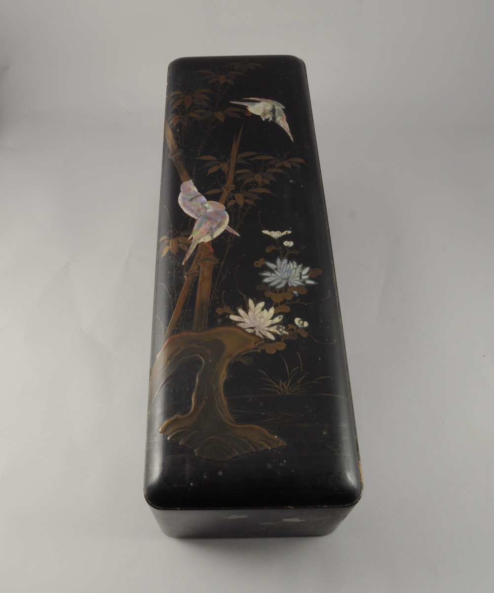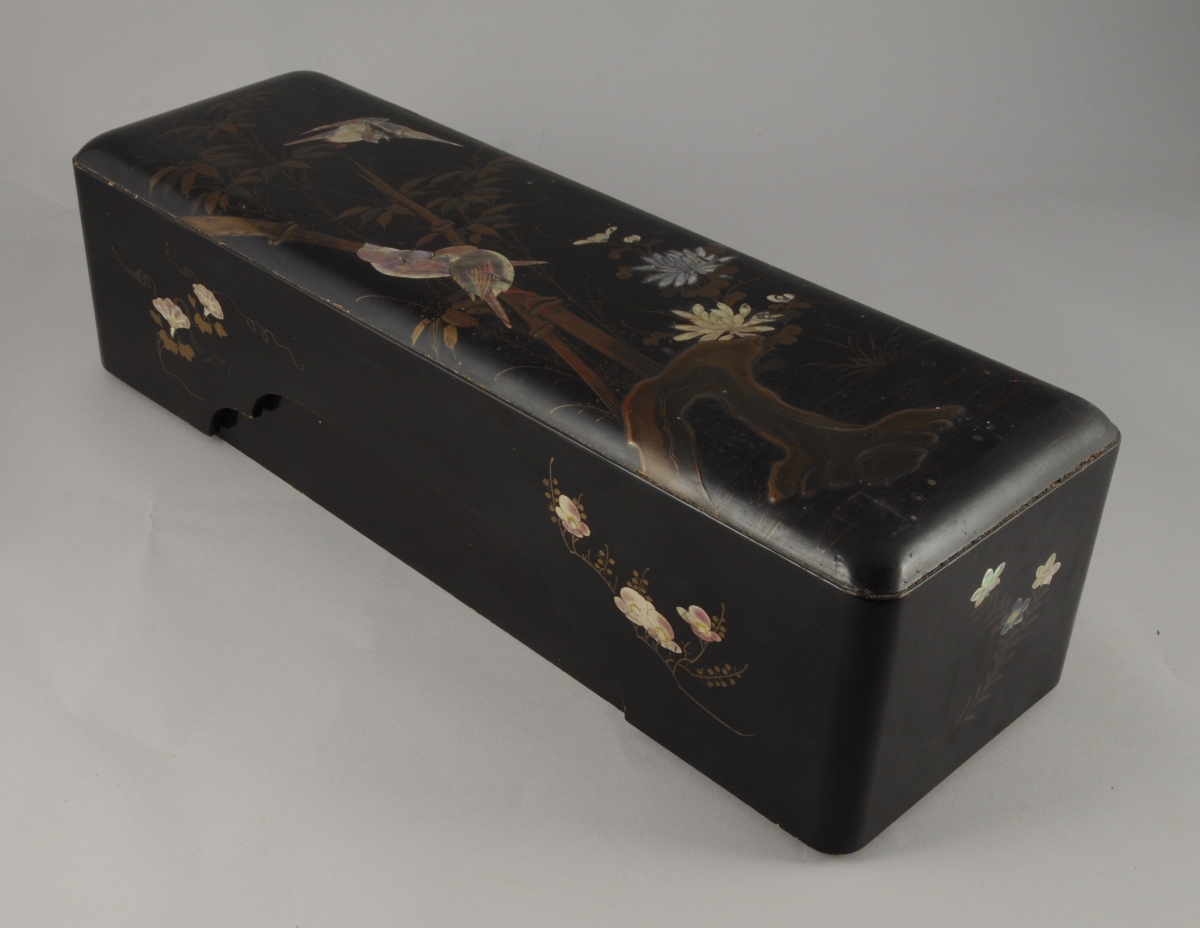 BOITE rectangulaire en bois peint à l'imitation du laque noir. Décor or agrémenté d'incrustations de nacre d'un rocher percé, bambous, oiseaux branchés, chrisanthèmes et fleurs de cerisier. Haut. 15, Long. 52, Prof. 17,5 cm. (usures)