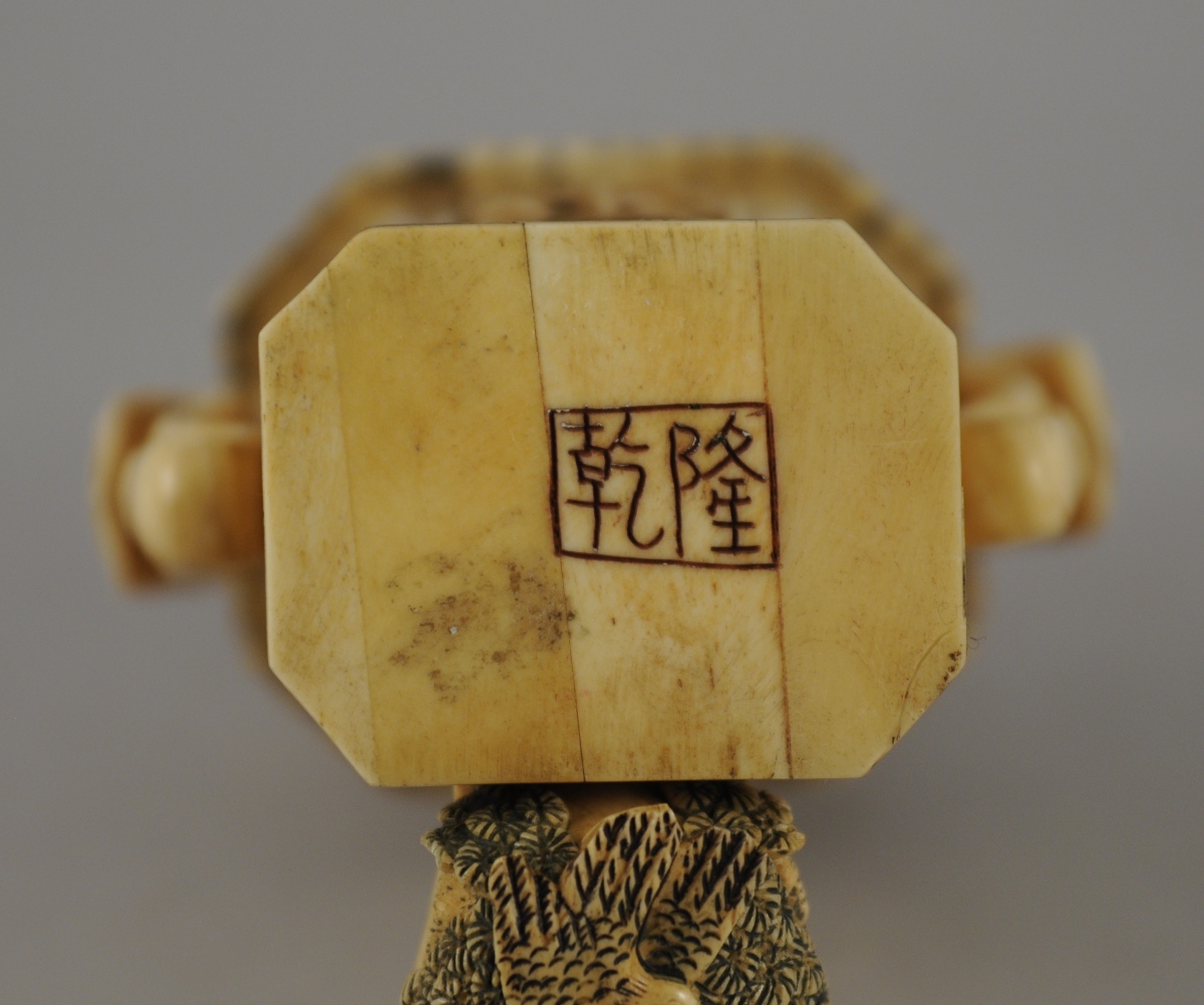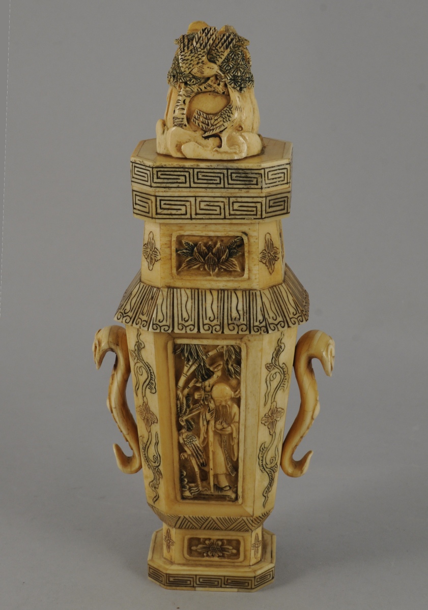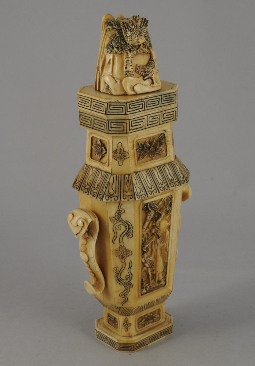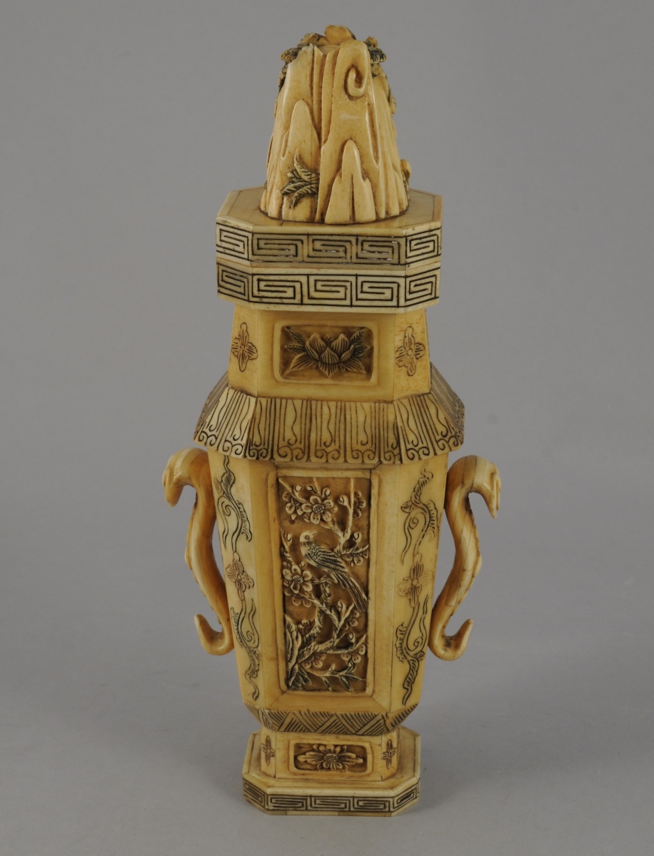 POTICHE COUVERTE constituée de plaquettes d'os, os sculpté et gravé. Elle figure Shou Lao à l'avant et un un oiseau branché à l'arrière. Elle recoit un décor de fleurs et feuillages stylisés, volutes et frises de postes. Elle présente deux oiseaux sur un rocher à l'amortissement. Signature sous la base. Tavail chinois du XXème.