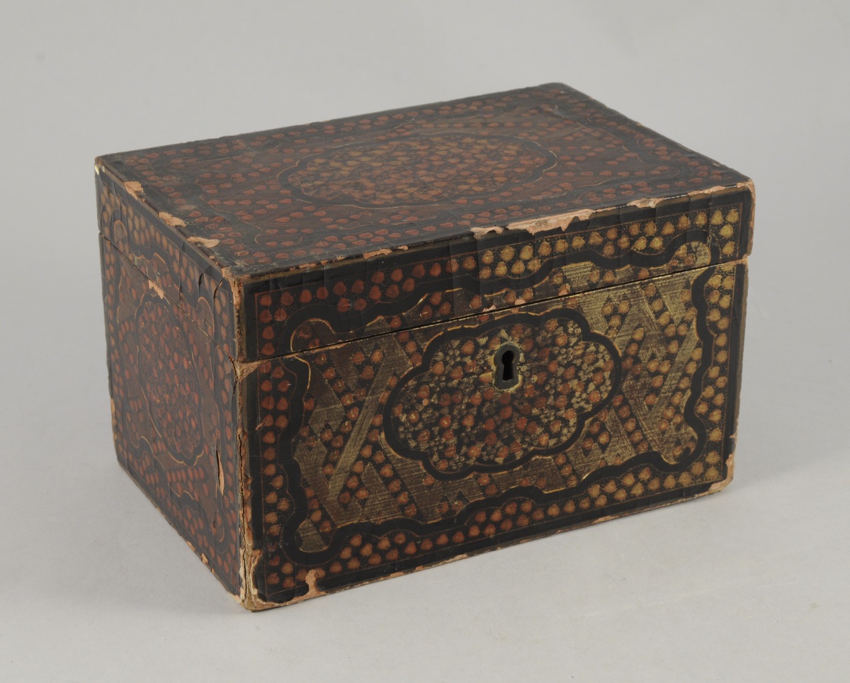 COFFRET à THÉ rectangulaire en laque rouge et or sur fond noir à décor floral stylisé. Il découvre deux boîtes à thé en étain estampé de fleurs et feuillages stylisés et volutes. Leurs couvercles ornés pour l'un, de pagodes et de grues dans un paysage. Dans le goût de la Chine. Fin XIXème. Haut. 12, Larg. 19,5, Prof. 13,5 cm. (manques, chocs, accidents)