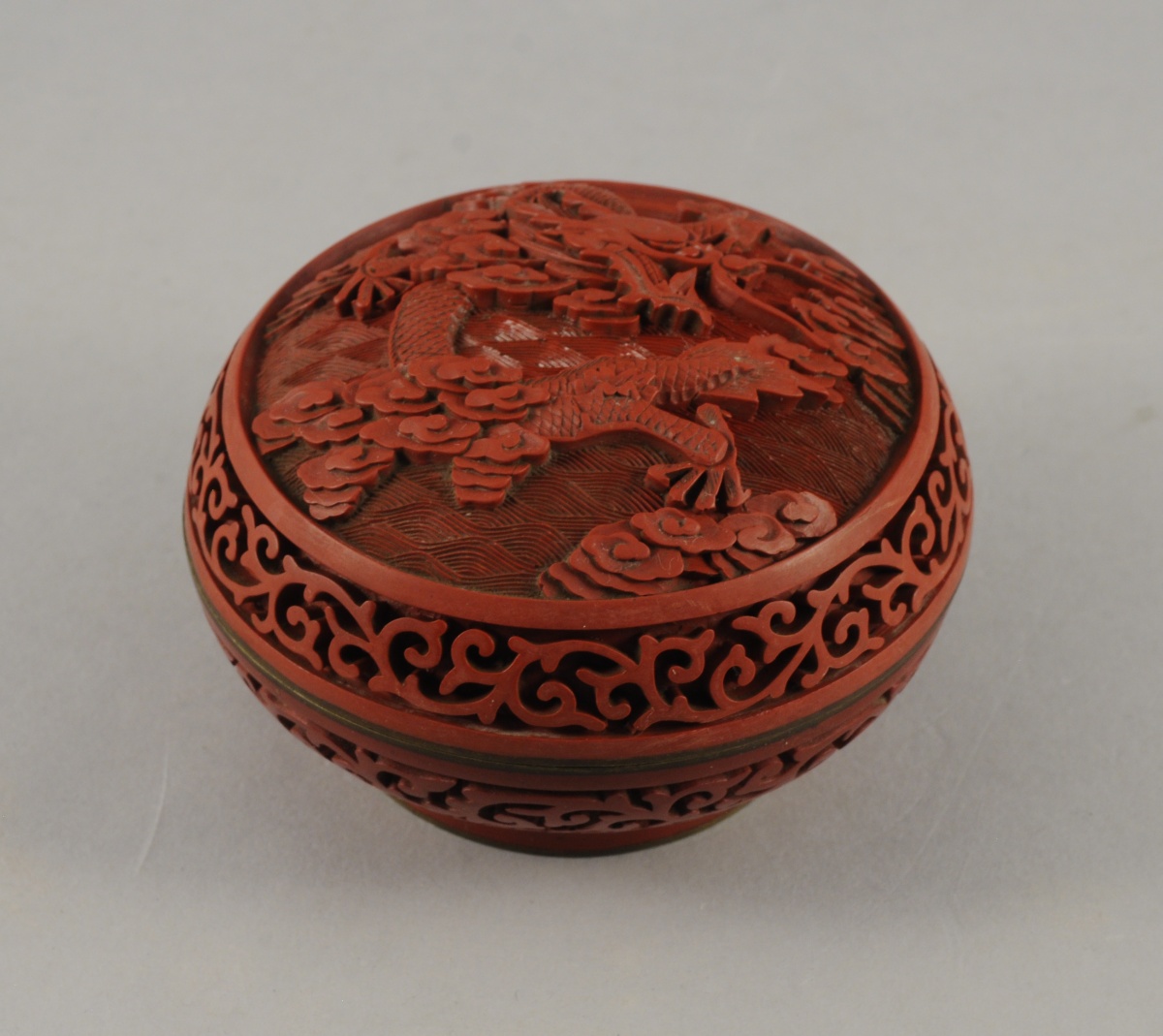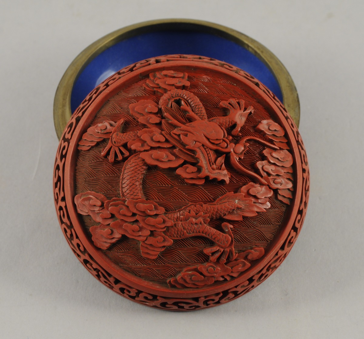 BOÎTE ronde en laque rouge. Décor d'un dragon volant dans les nuages. Intérieur en porcelaine bleue. Chine, travail moderne. Diam. 9 cm.