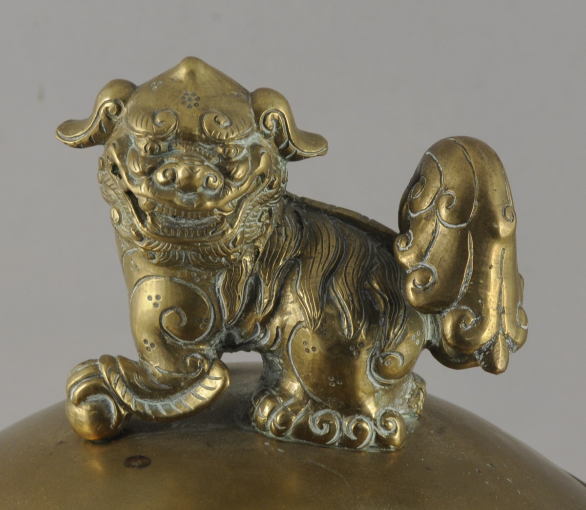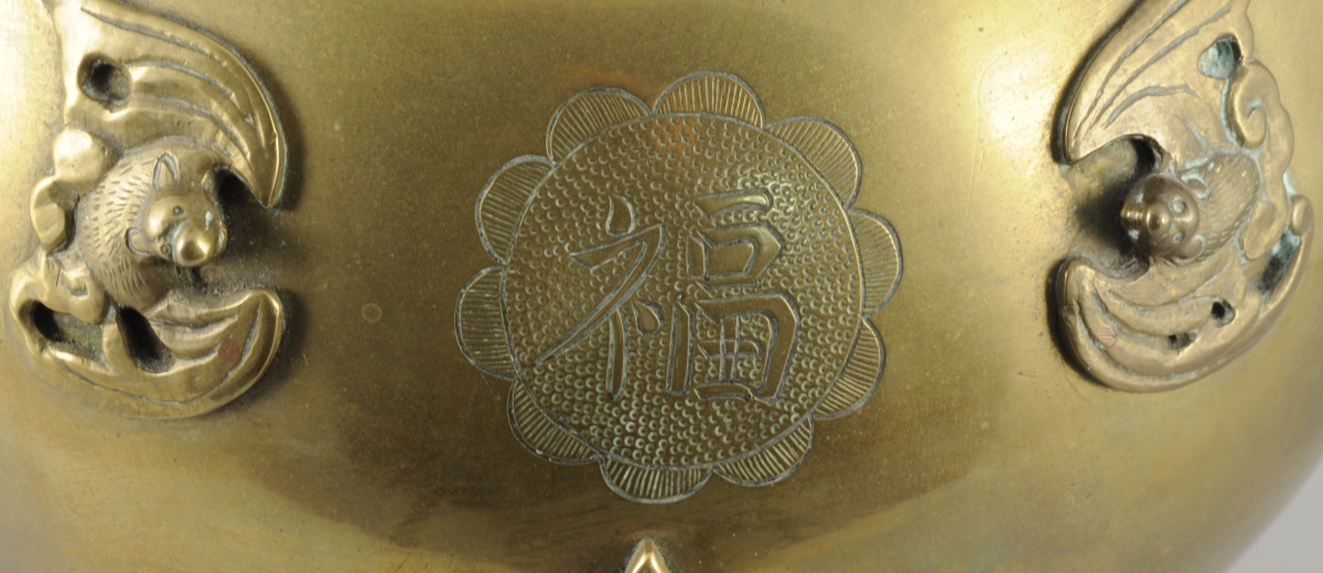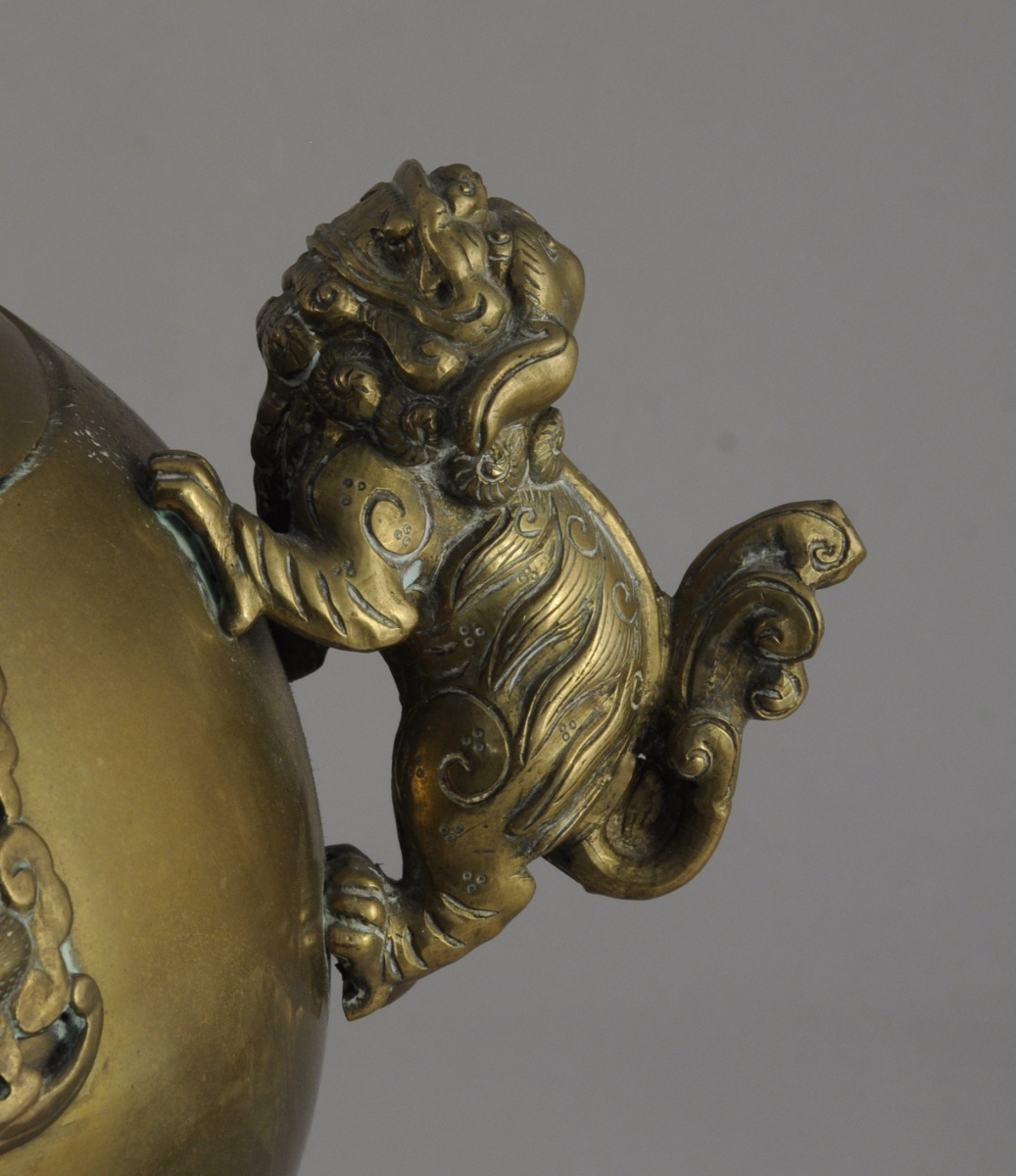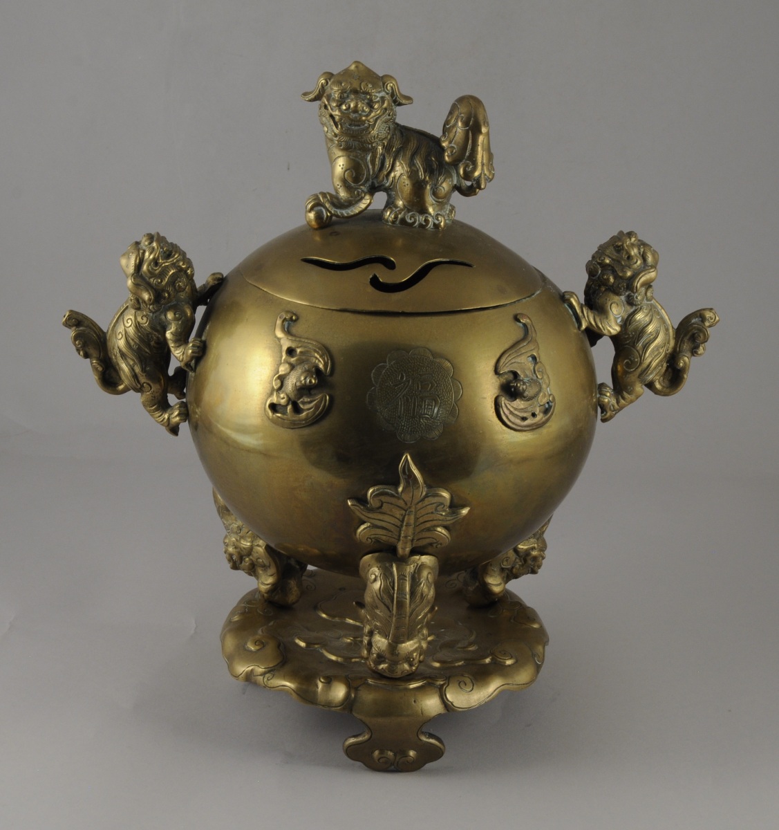 BRÛLE-PARFUM en bronze de forme boule sur un piétement tripode, aggrémenté de chiens de Fô sur le fretel, les anses et les pieds. Ornementation de chauve-souris et d'idéogrammes sur la panse. Base circulaire feuillagée. Indochine, XXème. Haut. 37, Larg. 39 cm.